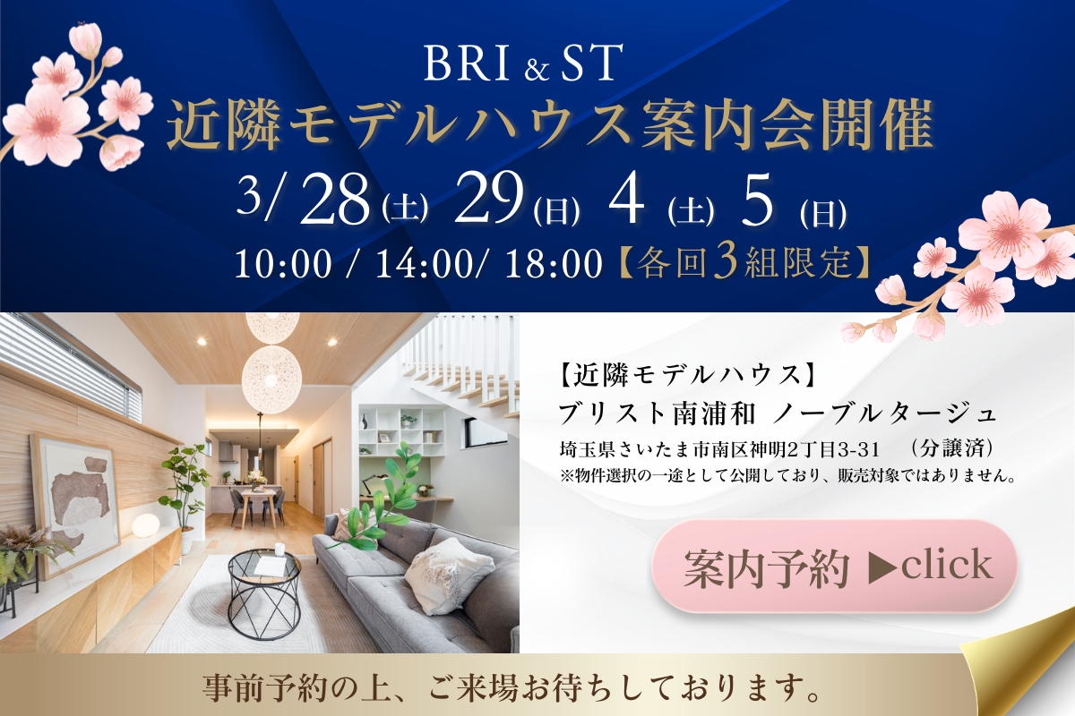開催日:3/28(土)29(日)4(土)5(日) 開催時間:10:00/14:00/18:00【各回3組限定】【近隣モデルハウス】 ブリスト南浦和 ノーブルタージュ(分譲済)埼玉県さいたま市南区神明2丁目3-31※物件選択の一途として公開しており、販売対象ではありません。ご予約はこちら▼▼
