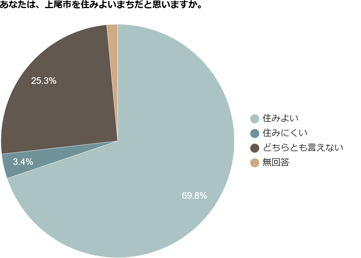 「上尾市を住みよいまちだと思うか」という質問では、「住みにくい」と回答した人はわずか3%で、およそ70%の人が「住みよい」と回答しています。
