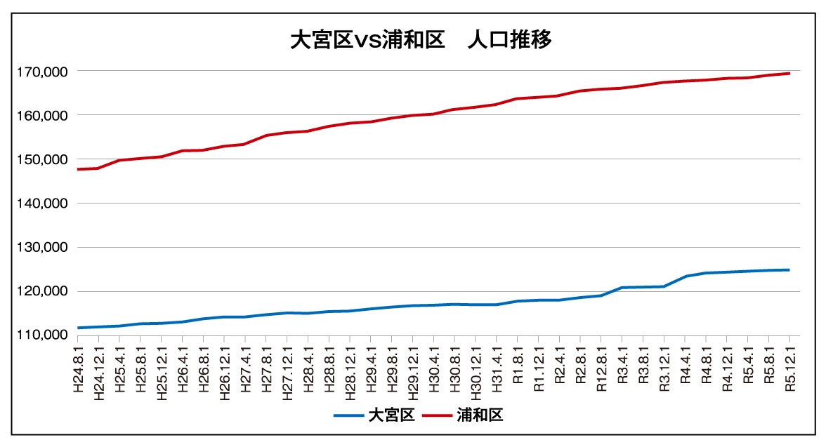 大宮区は発展が進むエリアで、人口も増加傾向にあります。一方の浦和区も歴史ある街並みを保ちつつ、人口が増加しております。