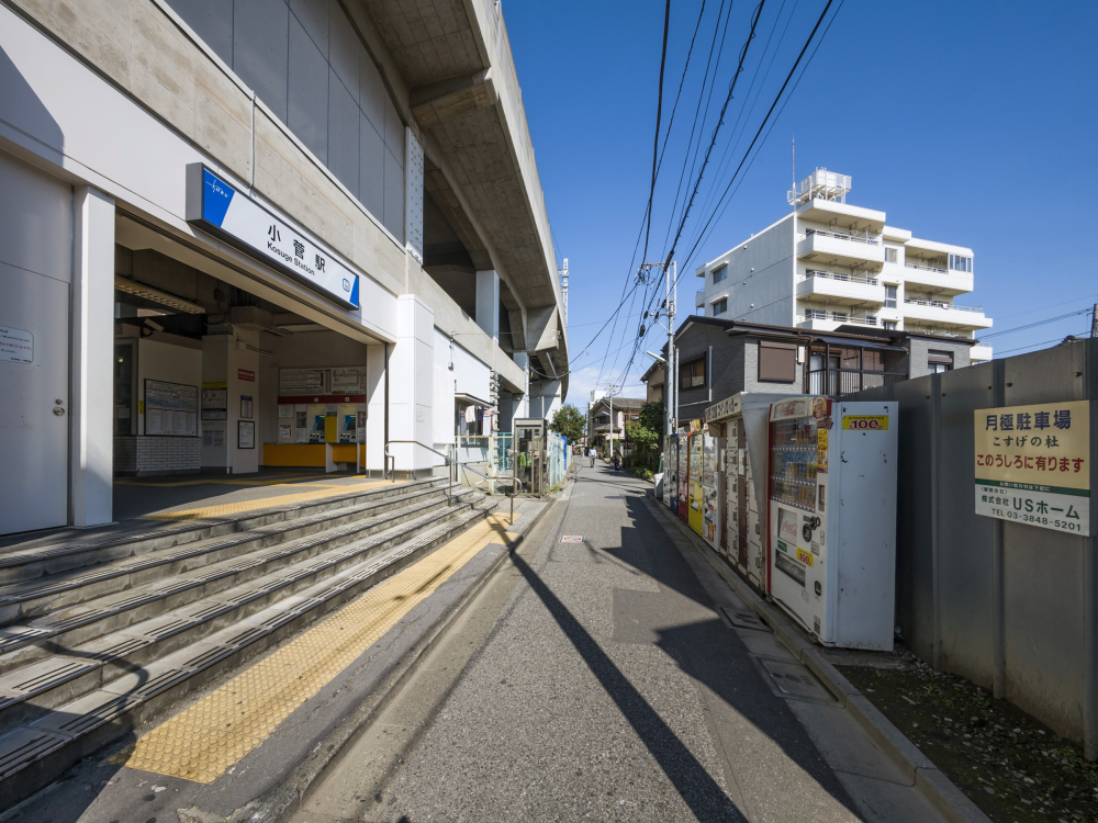 小菅駅は、駅前周辺はお店が少なく、静かな住宅街となっている。駅からすぐの場所には早朝から夜中まで営業しているスーパーマーケット「東武ストア」がある。荒川と綾瀬川に囲まれた小菅駅は東京ながら自然を感じられる立地である。荒川の河川敷には多くの野球場があり、週末は少年野球の活気のある声が川沿いを歩いていると感じられる。