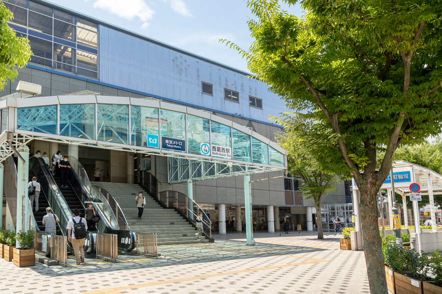 西葛西駅は、大手町駅や西船橋駅から乗り換えなしでアクセスできる西葛西駅。駅の南側にはバスロータリーがあり、バス路線も充実しています。駅前は商業施設が多く、高架下には商店街「西葛西メトログルメ・ショッピングセンター」があり外食やショッピングに便利です。公園施設も駅を取り巻くように整備され、中でも徒歩13分にある行船公園は30,000㎡の広さで子連れに人気のスポットです。園内には江戸川区自然動物園があり、入園料は無料です。