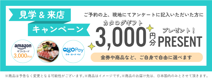 【見学予約特典の進呈要件について】 ※当WEBサイトから見学予約を申込み、予約日時に現地へ来場し、アンケートに答えていただいた方を対象とさせていただきます。 ※カタログギフト券のコードは、ご来場日の翌月上旬に、頂いたメールアドレスへ送付します。メールアドレスの不備やドメイン拒否等の理由でメールが届かなかった場合、無効とさせていただきます。 ※本特典は、売主、(株)中央住宅 戸建分譲大宮事業所の分譲地へ複数回見学予約を頂いても、1家族様につき初回の1回のみの進呈とさせていただきます。 ※本特典は、(株)中央住宅 戸建分譲大宮事業所が不正とみなしたお客様は対象外とさせていただきます。 ※本キャンペーンは、(株)中央住宅 戸建分譲大宮事業所による提供です。本キャンペーンについてのお問い合わせは、(株)中央住宅 戸建分譲大宮事業所【0120-911-851】までお願いいたします。