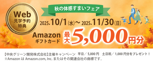 ※Amazonギフトカード番号を、ご来場日の翌月上旬に、頂いたメールアドレスへ送付します。メールアドレスの不備やドメイン拒否等の理由でメールが届かなかった場合、無効とさせていただきます。また、Amazonギフトカード番号の送付メールは再送いたしかねますので、ご了承ください。※本特典は、売主、中央グリーン開発株式会社の分譲地へ複数回見学予約を頂いても、1家族様につき初回の1回のみの進呈とさせていただきます。※本特典は、中央グリーン開発株式会社が不正とみなしたお客様は対象外とさせていただきます。