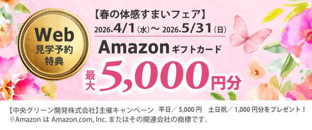 ※Amazonギフトカード番号を、ご来場日の翌月上旬に、頂いたメールアドレスへ送付します。メールアドレスの不備やドメイン拒否等の理由でメールが届かなかった場合、無効とさせていただきます。また、Amazonギフトカード番号の送付メールは再送いたしかねますので、ご了承ください。※本特典は、売主、中央グリーン開発株式会社の分譲地へ複数回見学予約を頂いても、1家族様につき初回の1回のみの進呈とさせていただきます。※本特典は、中央グリーン開発株式会社が不正とみなしたお客様は対象外とさせていただきます。