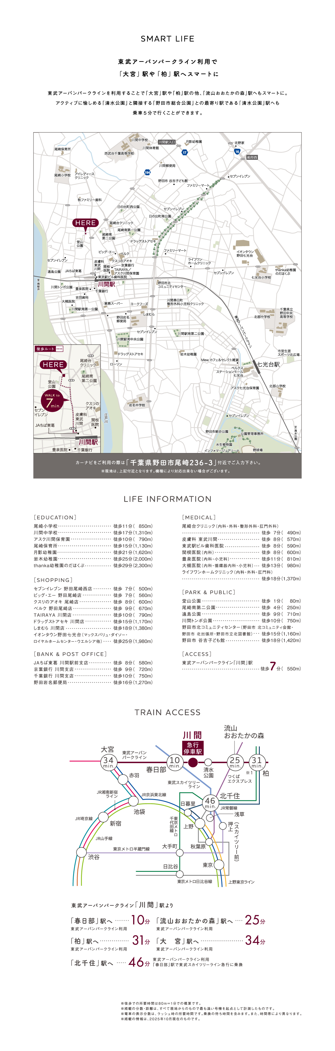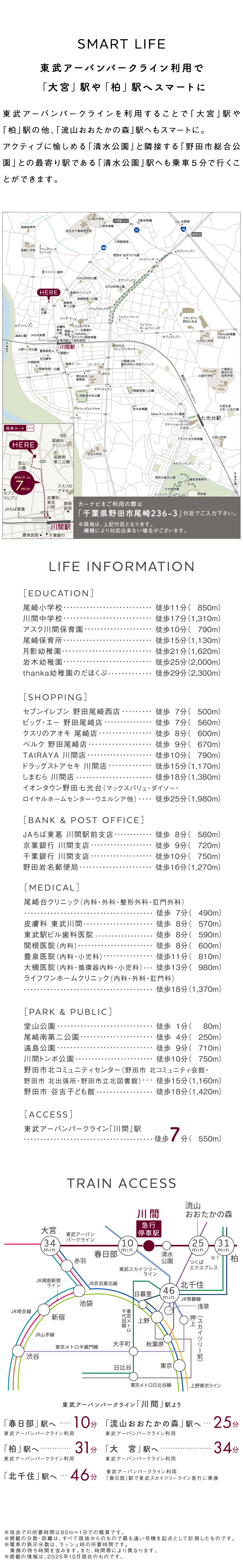 アクセス ●川間駅より春日部駅まで【ラッシュ時: 10分 東武アーバンパークライン(大宮行)利用。】【平常時: 10分 東武アーバンパークライン(大宮行)利用。】