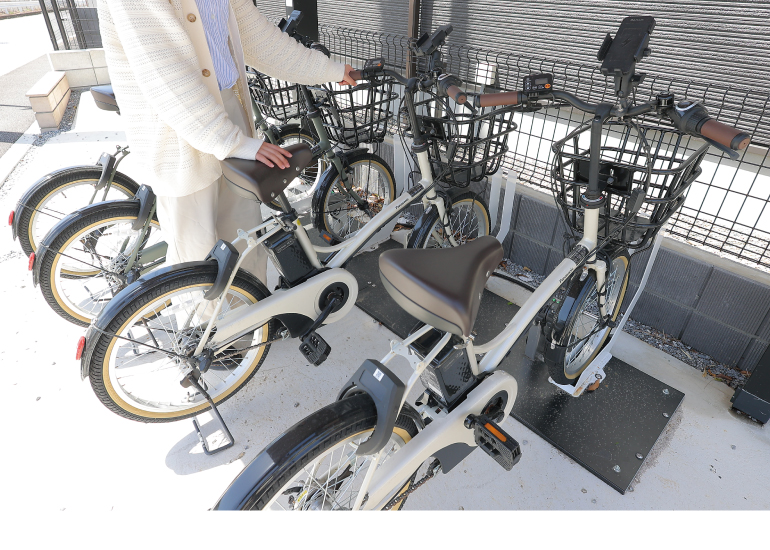 街の住人みんなで使える自転車があります。事前にスマートフォンからも予約できるので、行動範囲が広がりそうです。