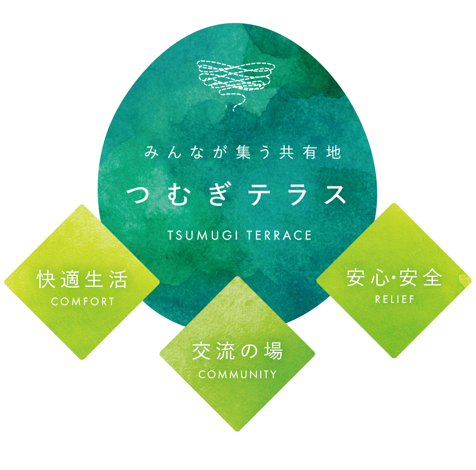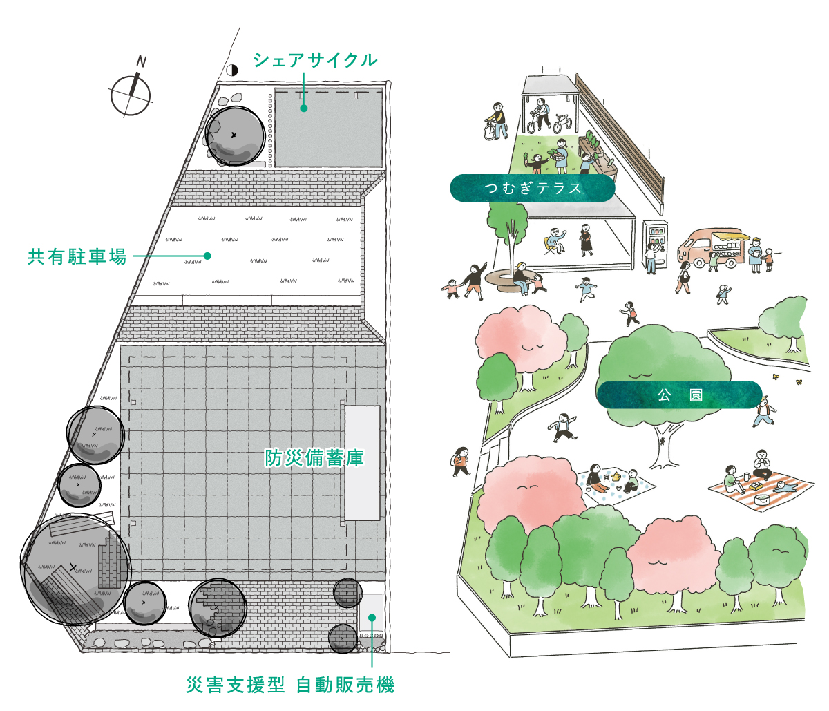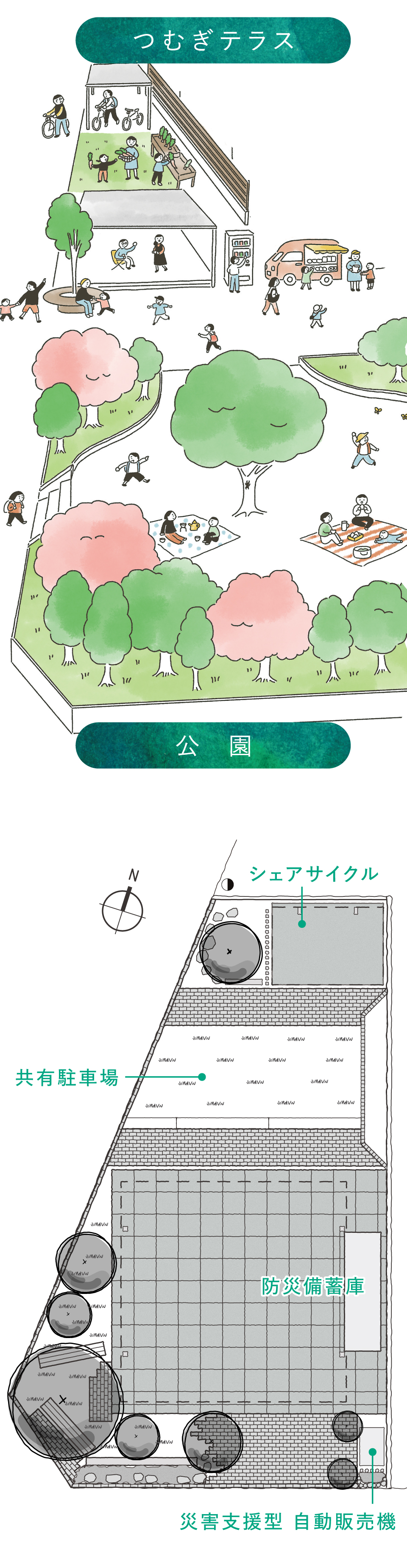 つむぎテラスの入口と公園の入口を近づけ、行き来をスムーズにすることで自然に挨拶や会話を交わす機会を創出します。