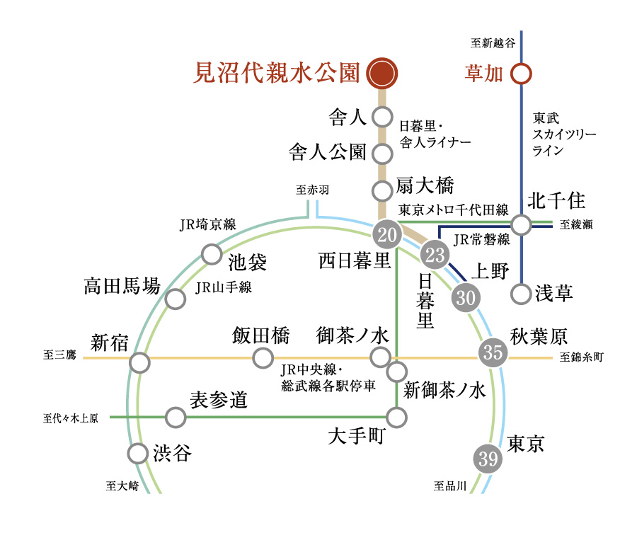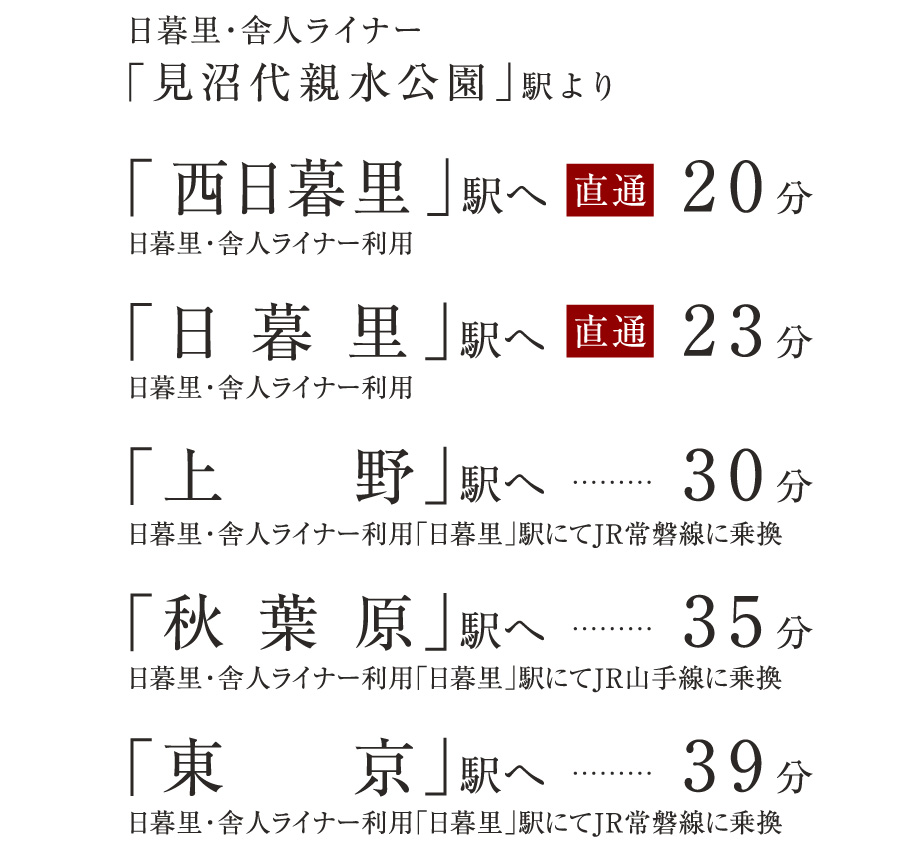 アクセス ●見沼代親水公園駅より西日暮里駅まで【ラッシュ時: 20分 日暮里・舎人ライナー(日暮里行)利用。】