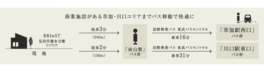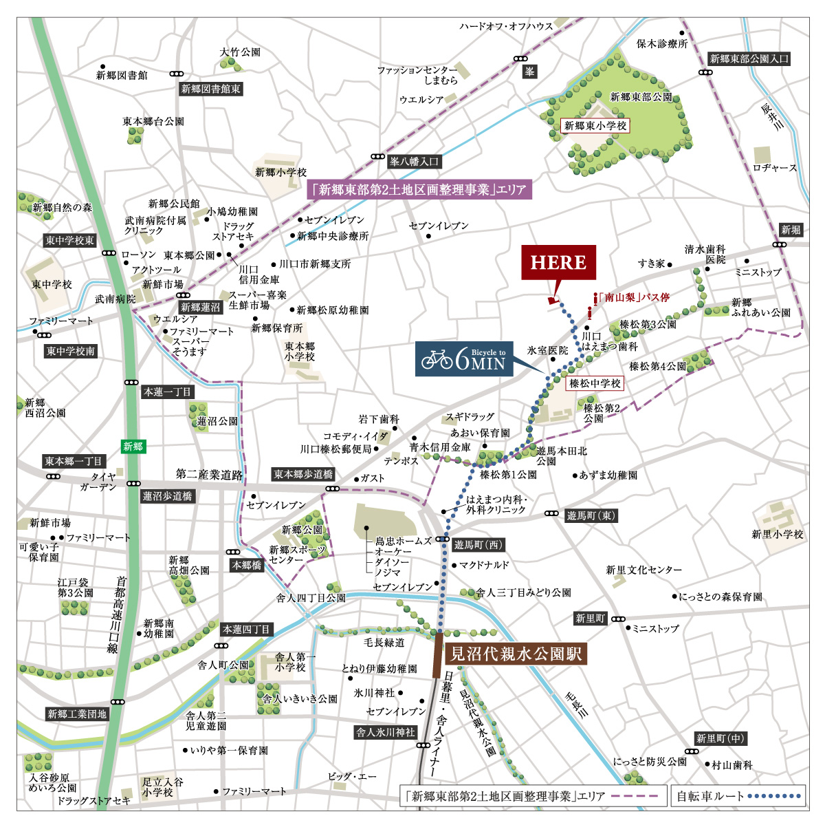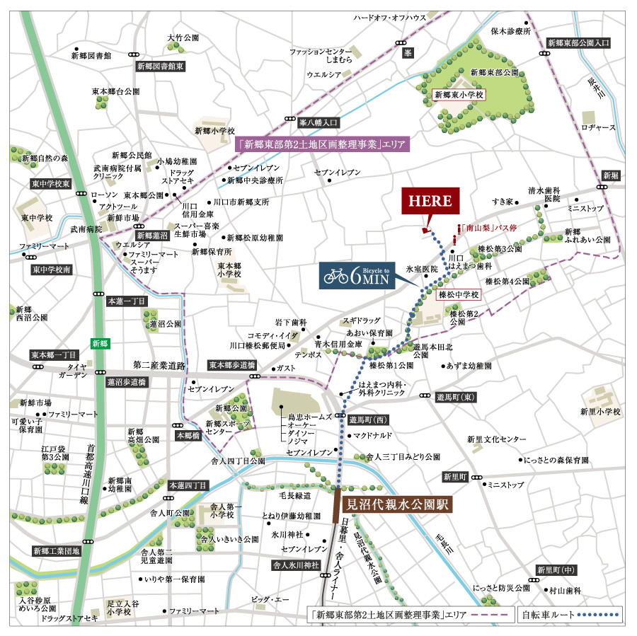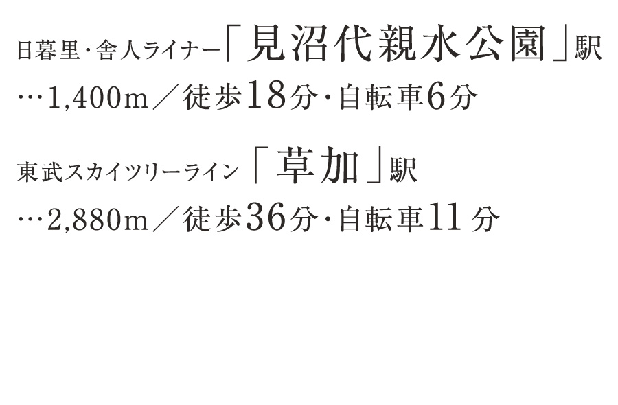 日暮里・舎人ライナー「見沼代親水公園」駅利用、自転車6分(※実測) 東武スカイツリーライン「草加」駅利用、自転車11分(※実測)
