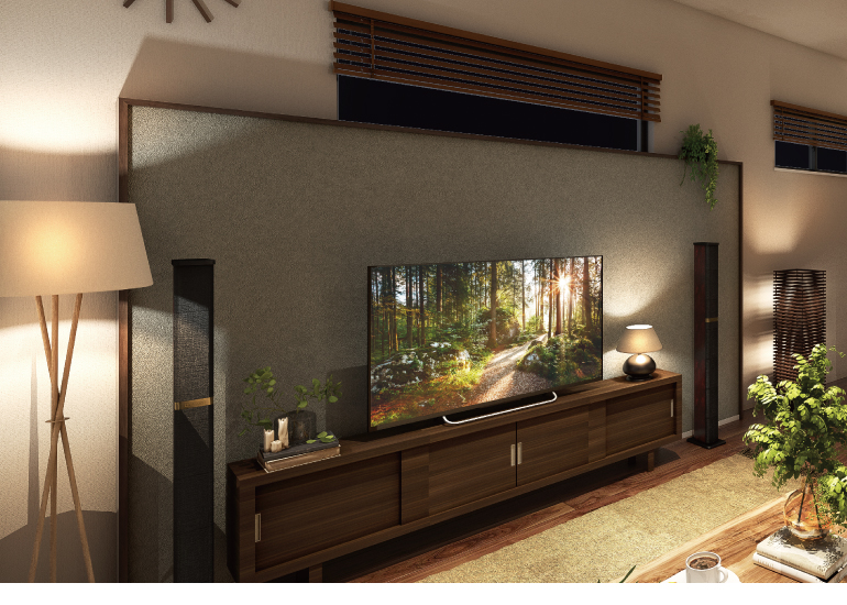 漆喰を大胆に塗ったような、おおらかな揺らぎが印象的なクロスを、TVボードの背面にアクセントとして採用しました。やわらかな質感が、団らん空間を穏やかな空気で満たします。