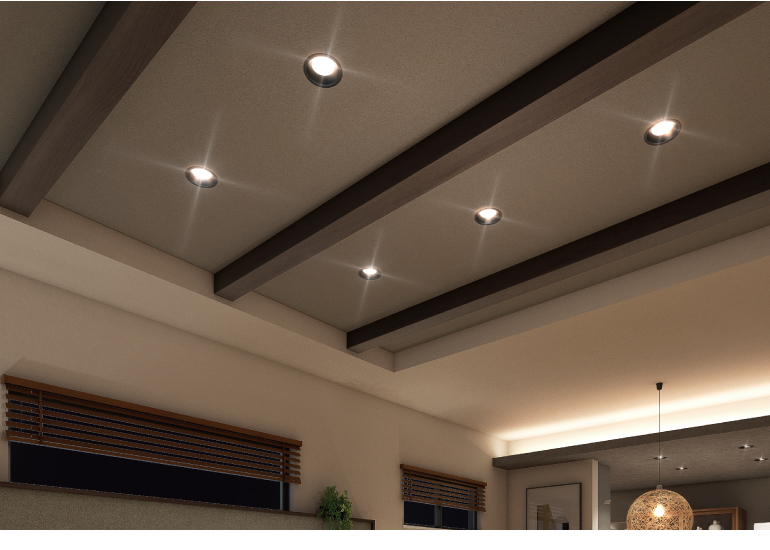 リビングの一部を折り上げ天井にし、アクセントクロスを採用。さらに梁あらわしとすることで、空間に高級感と広がり、味わいを演出しました。上質でゆとりあるくつろぎを味わえます。