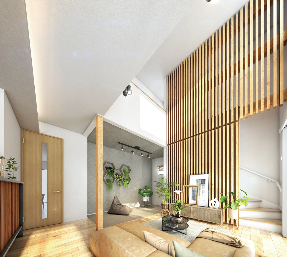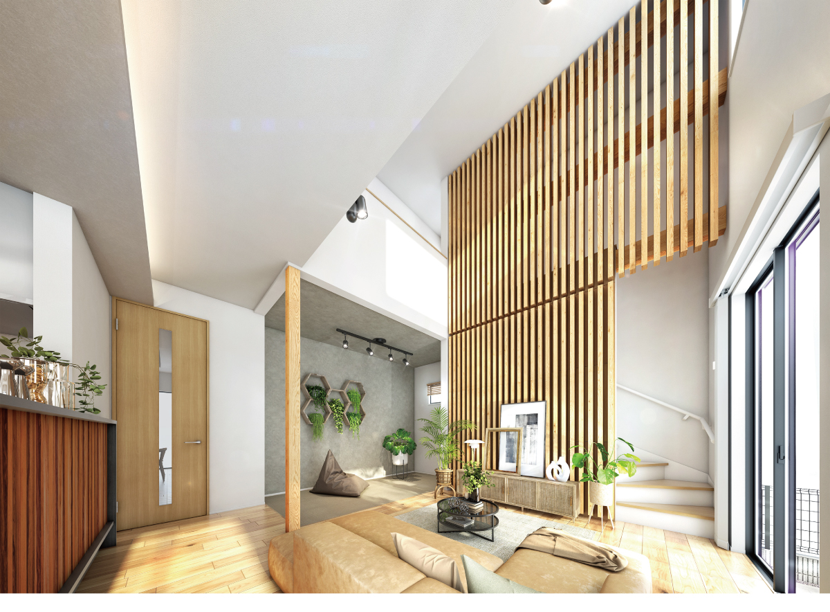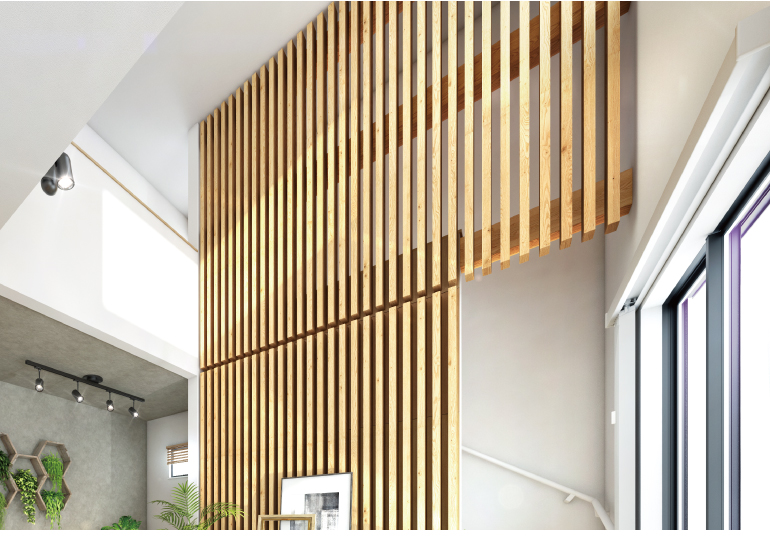 木の味わいと個性をLDKにまとわせ、モダンに装う化粧柱。光や風を通す透かしのあるデザインは上品かつ軽やかで、空間を仕切りながらもさりげない繋がりを描きます。