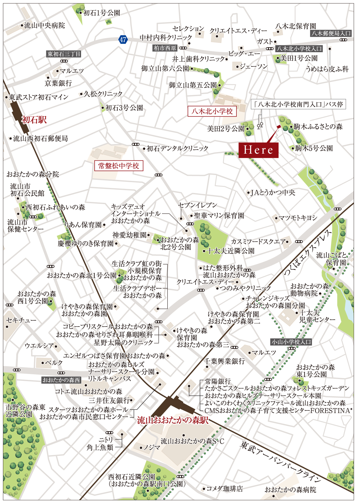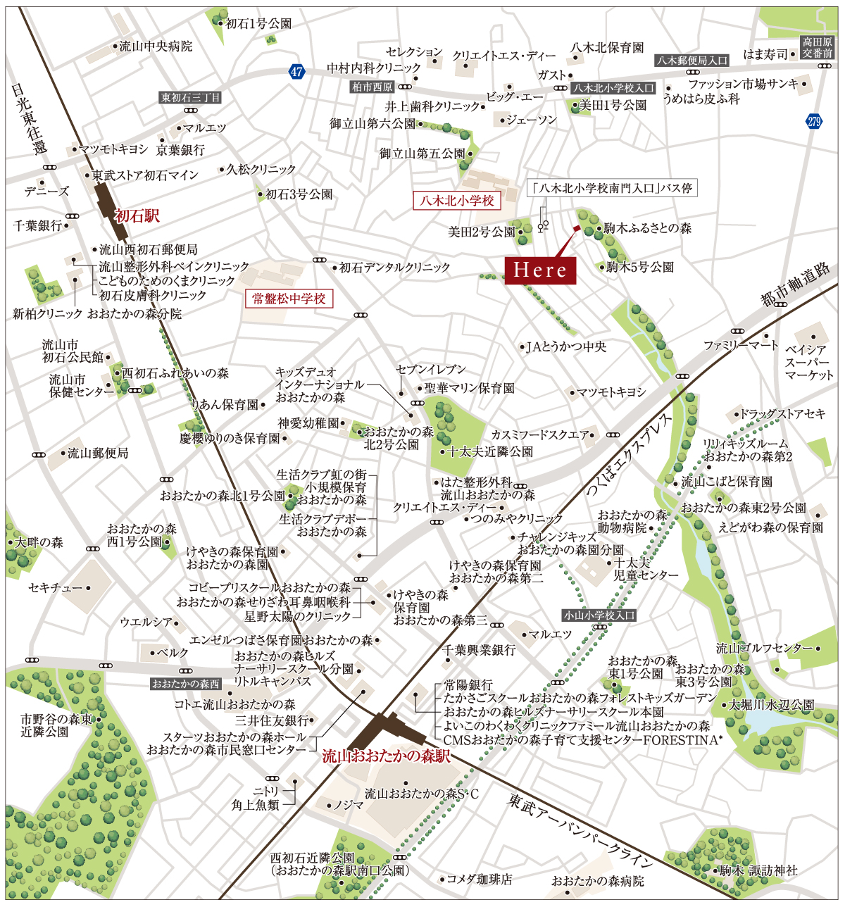 交通 東武アーバンパークライン・つくばエクスプレス「流山おおたかの森」駅まで徒歩21分