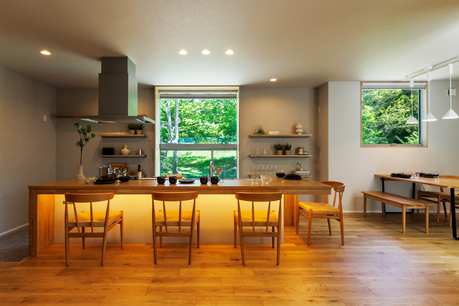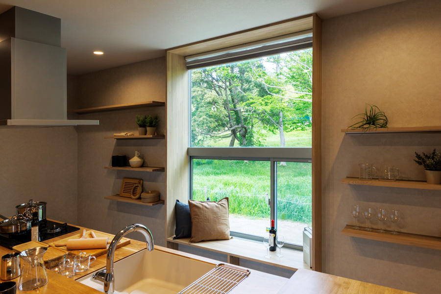 ◆緑地の景観をパノラマに切り取る、キッチン・カウンター横の「パノラマサッシ」