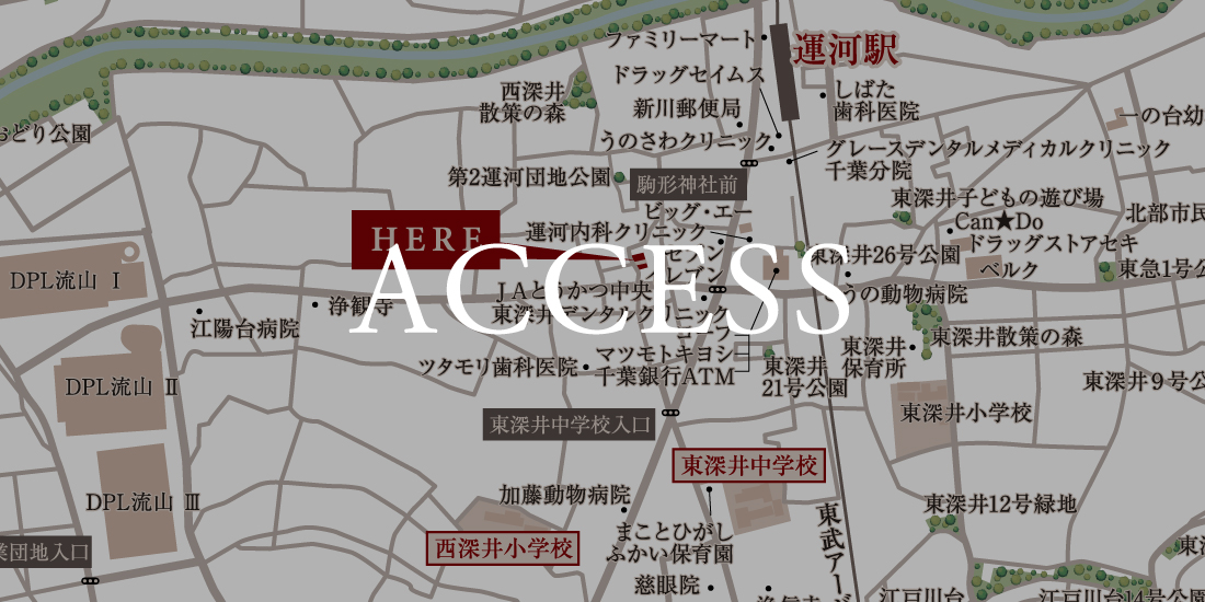 アクセス ●運河駅より流山おおたかの森駅まで【ラッシュ時: 7分 東武アーバンパークライン(柏行)利用。】