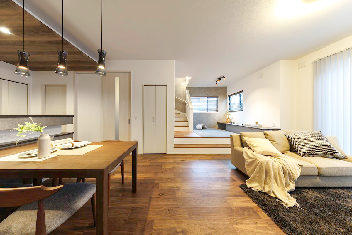 温かみのある色合いと上質な素材が調和し、洗練された雰囲気を醸し出すリビング。家族の団らんをより心地よい時間へと導きます。※9号棟/2026年2月撮影