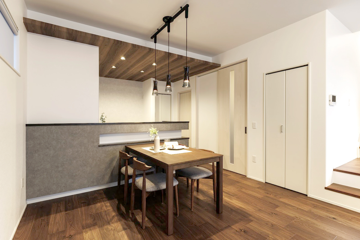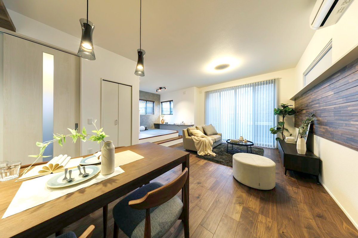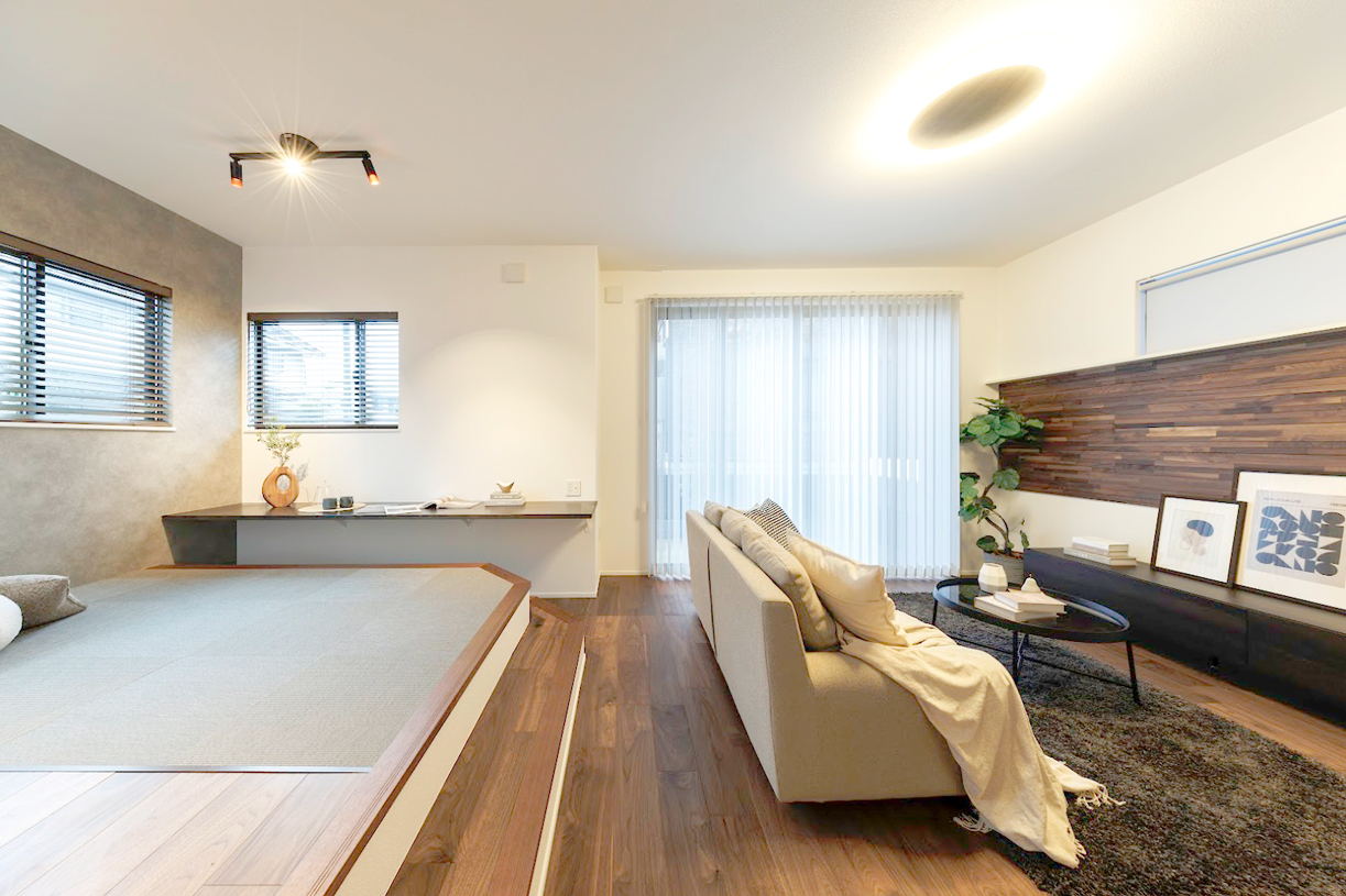 • 天然木の個性や魅力を引き出した銘木の壁材をリビングに採用しました。※9号棟/2026年2月撮影