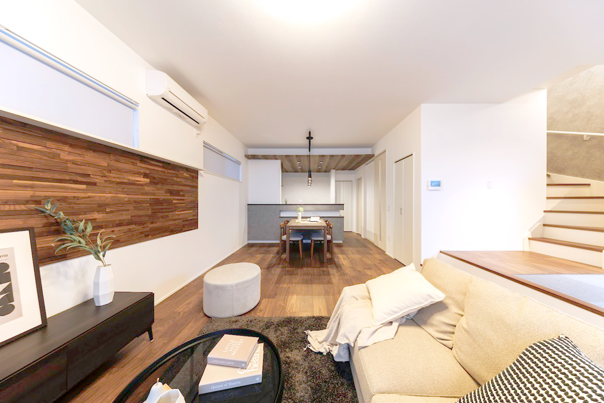 天然木の個性や魅力を引き出した銘木の壁材をリビングに採用しました。※9号棟/2026年2月撮影
