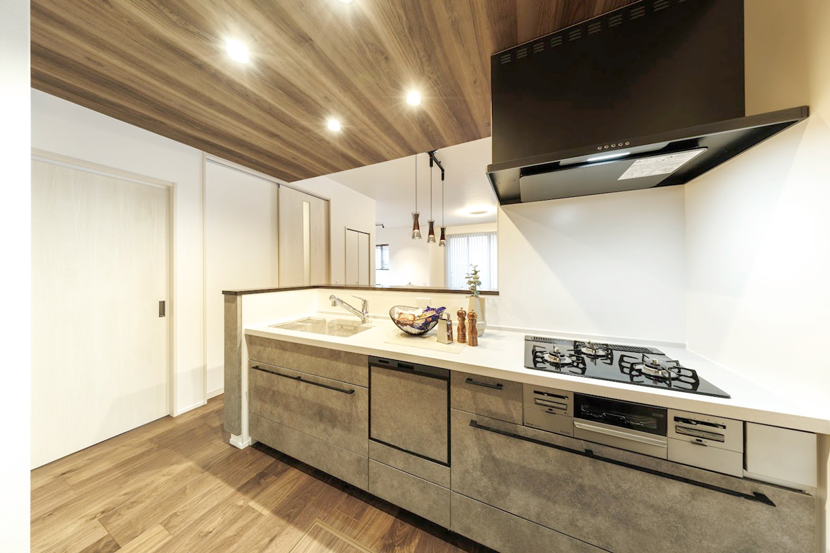家事を効率的に行えるように配慮した水廻り集中プラン。収納スペースが充実していて、食洗機付きの機能性の良いキッチンです。※9号棟/2026年2月撮影