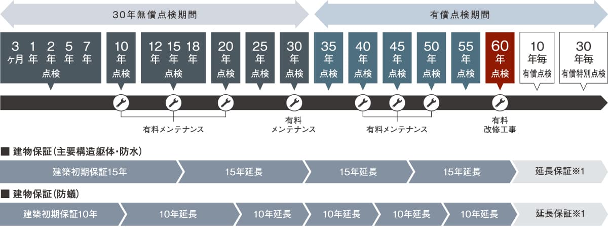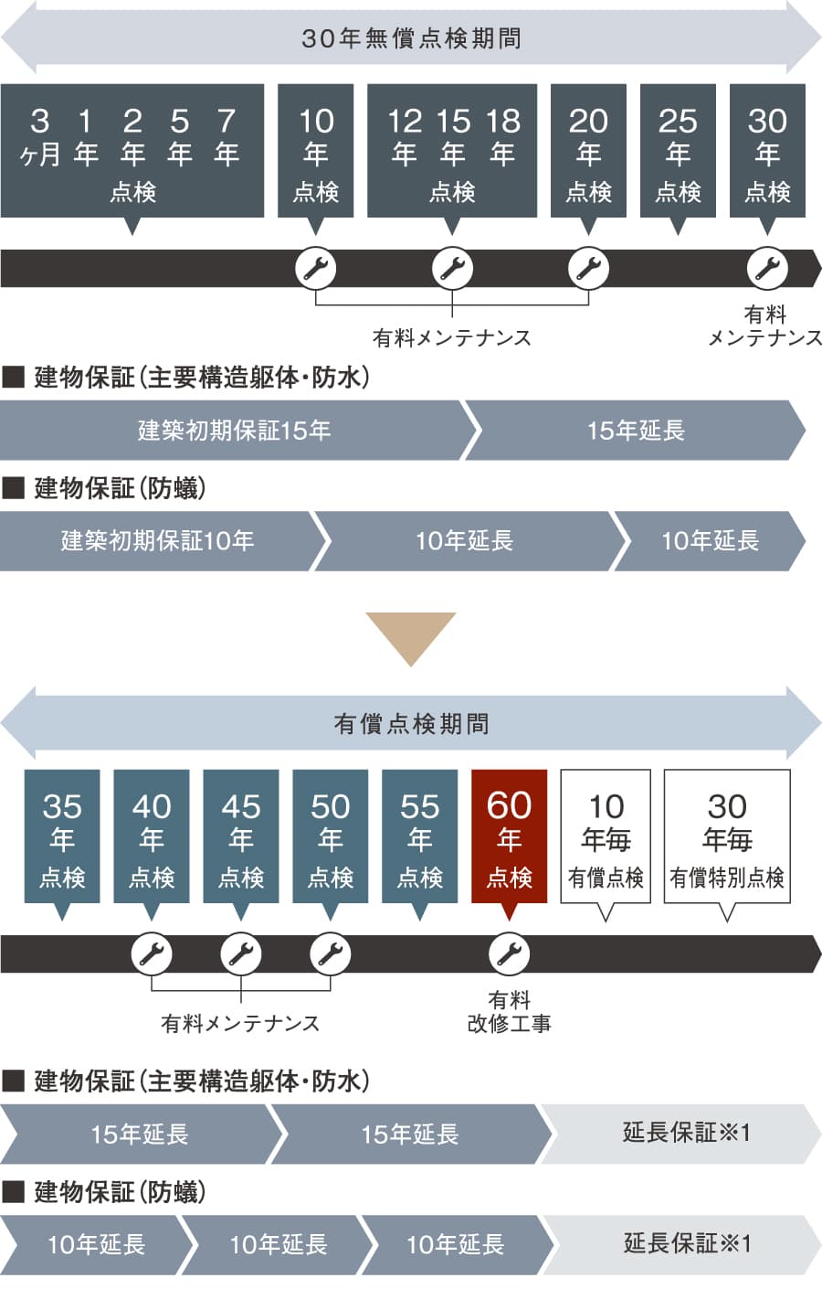 将来を見据えた長期サポート 【ロングサポート60】 建物を長期維持していくための「維持保全計画」を作成し、それに連動した定期点検プログラムとメンテナンス及び保証計画で長期優良住宅に対応する、ポラスグループのアフターメンテナンス部門による長期保証アフターメンテナンスシステムです。 | ![]() ※1 60年以降も定期メンテナンスにより延長保証可能 |