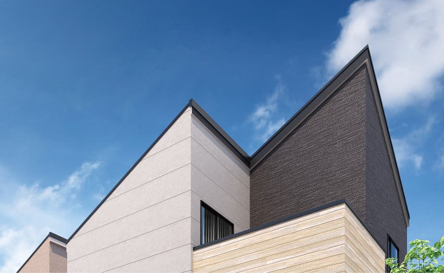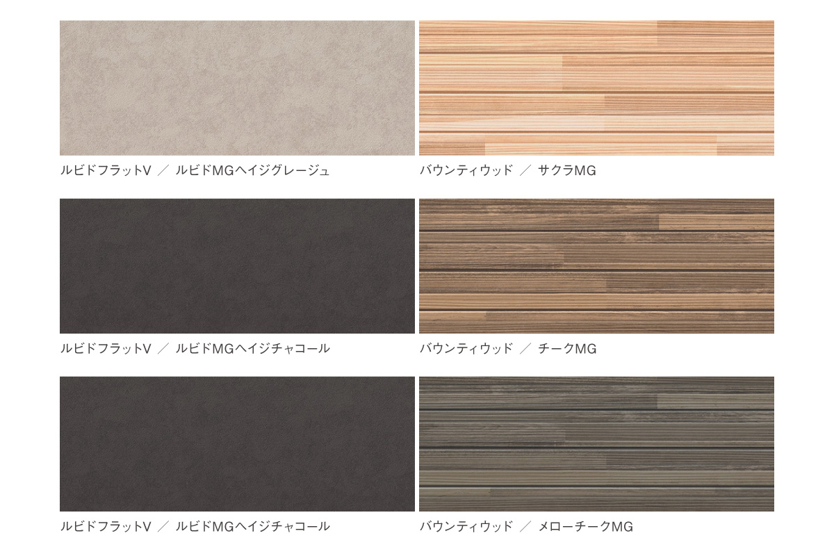 均一な梨地仕上げのシンプルな「ルビドフラットV」に、木目の美しい上質な樹種をラインナップした、樹種それぞれの色彩豊かな木目が美しい「バウンティウッド」がアクセントとなり、外観を華やかに彩ります。