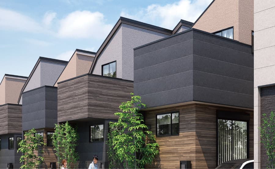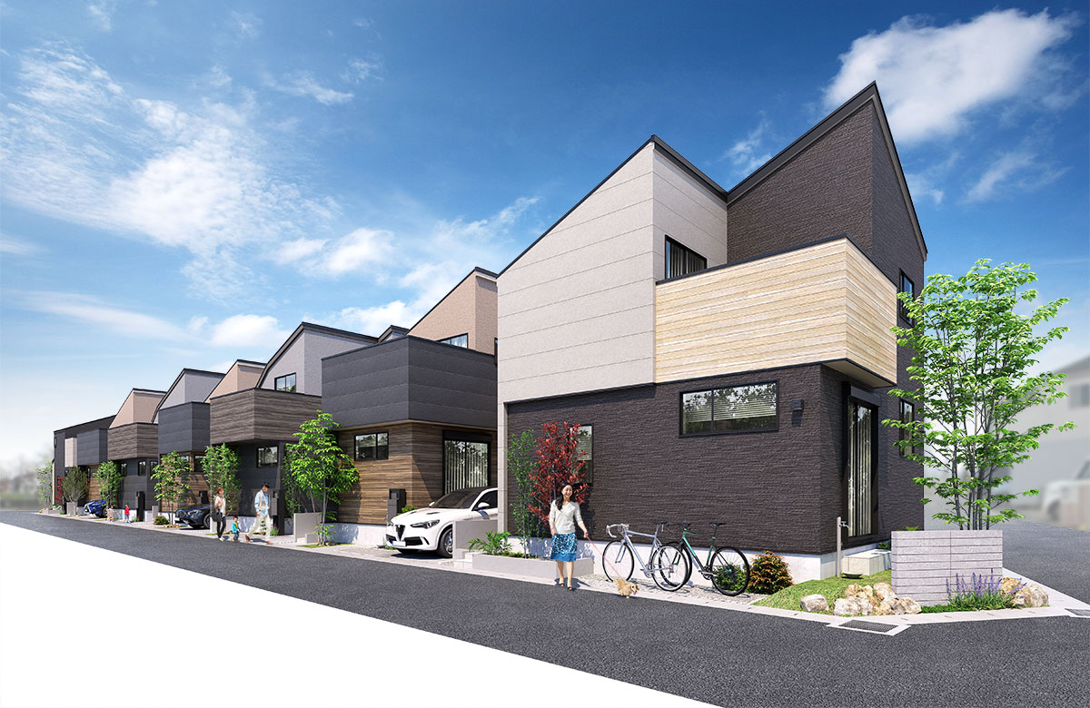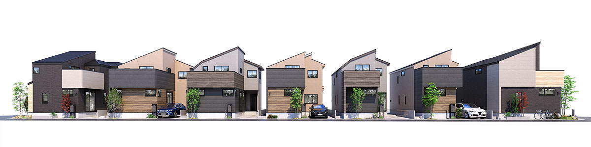 空に映える片流れ屋根やアクセントとなるバルコニーの、質感豊かな外壁が織りなす多彩な意匠が、一邸ごとの個性を際立たせながらも、統一されたデザインによって調和し、洗練された美しい風景を創出します。