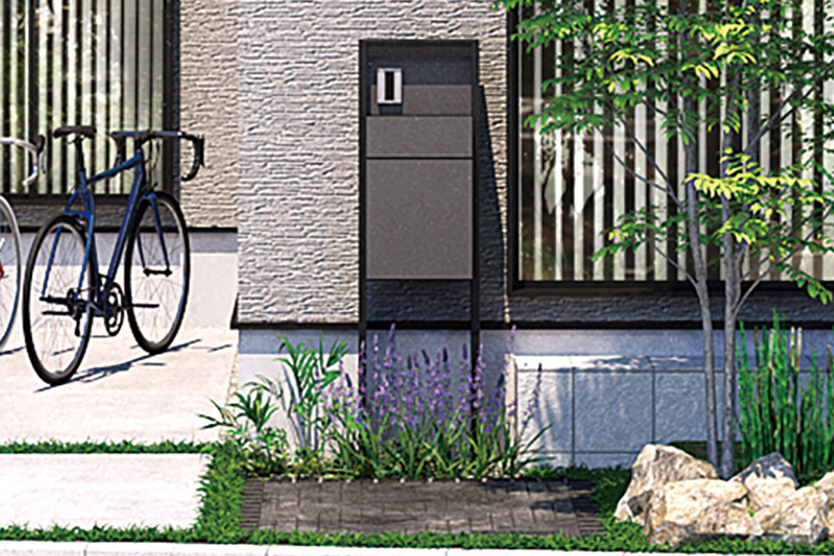 ![]() 宅配ボックス付機能門柱 宅配ボックスとTVホンが一体となったスタイリッシュな機能門柱。日中不在がちなご家族も再配達の手間が省けます。 | ![]() 植栽計画 外観のアクセントとなる高木や足元を彩る緑を採用。自然素材のピンコロ石やロックガーデンと調和し豊かな表情を創出します。 |