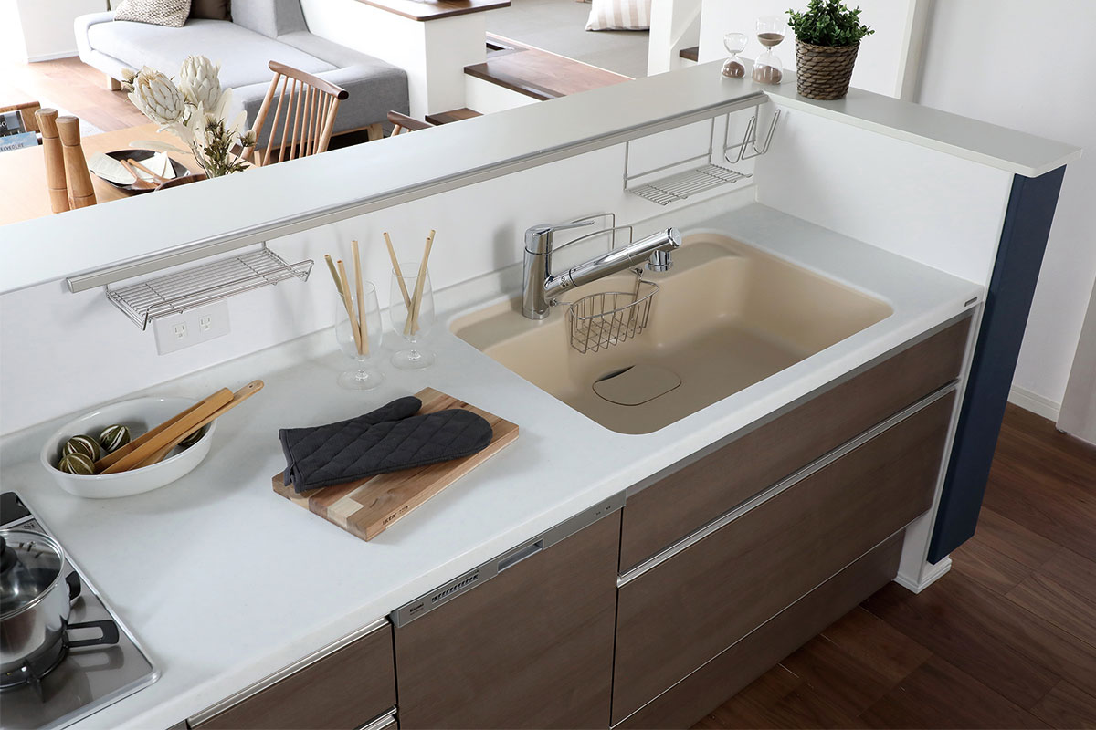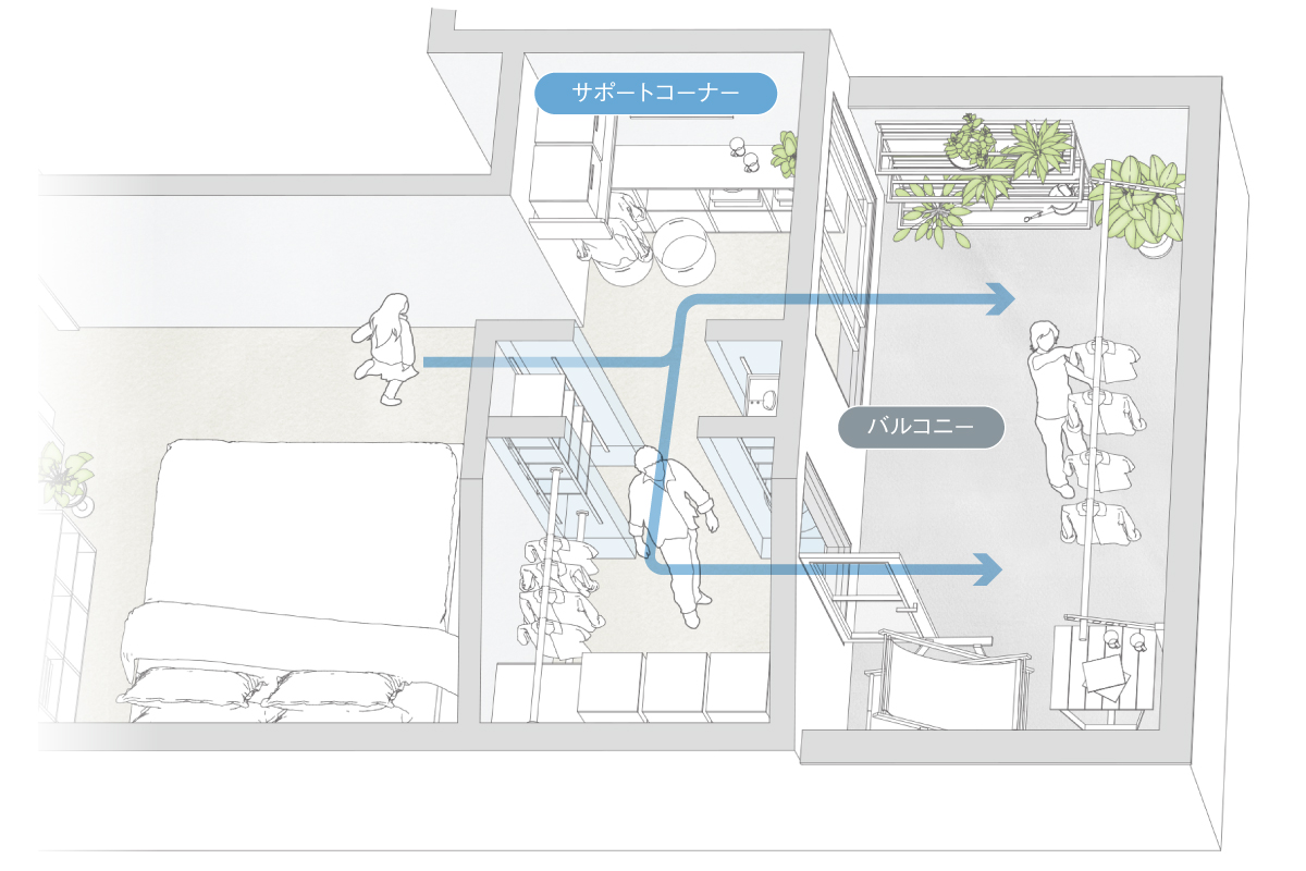 バルコニーに隣接した収納と家事スペースを兼ね備えた機能的なサポートコーナー。洗濯後の作業をその場で完結でき、効率的な家事動線を実現します。扉や壁を設けないオープンな収納により、出し入れもスムーズです。