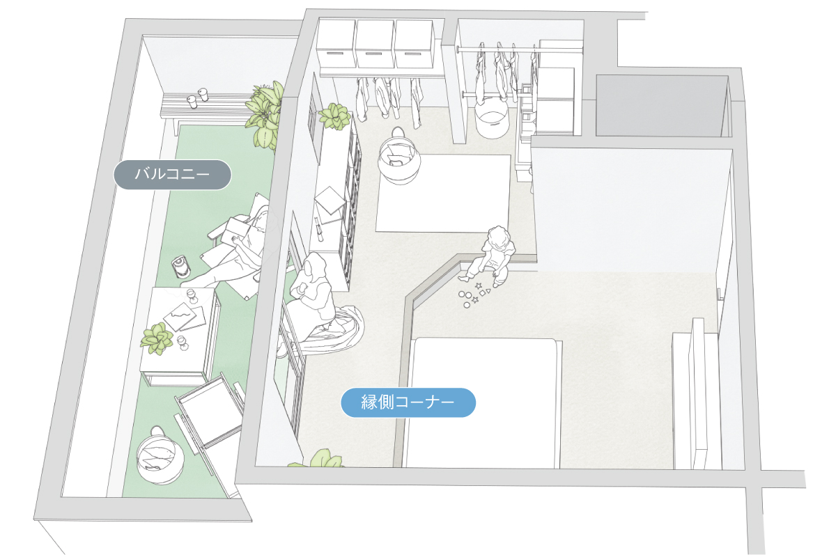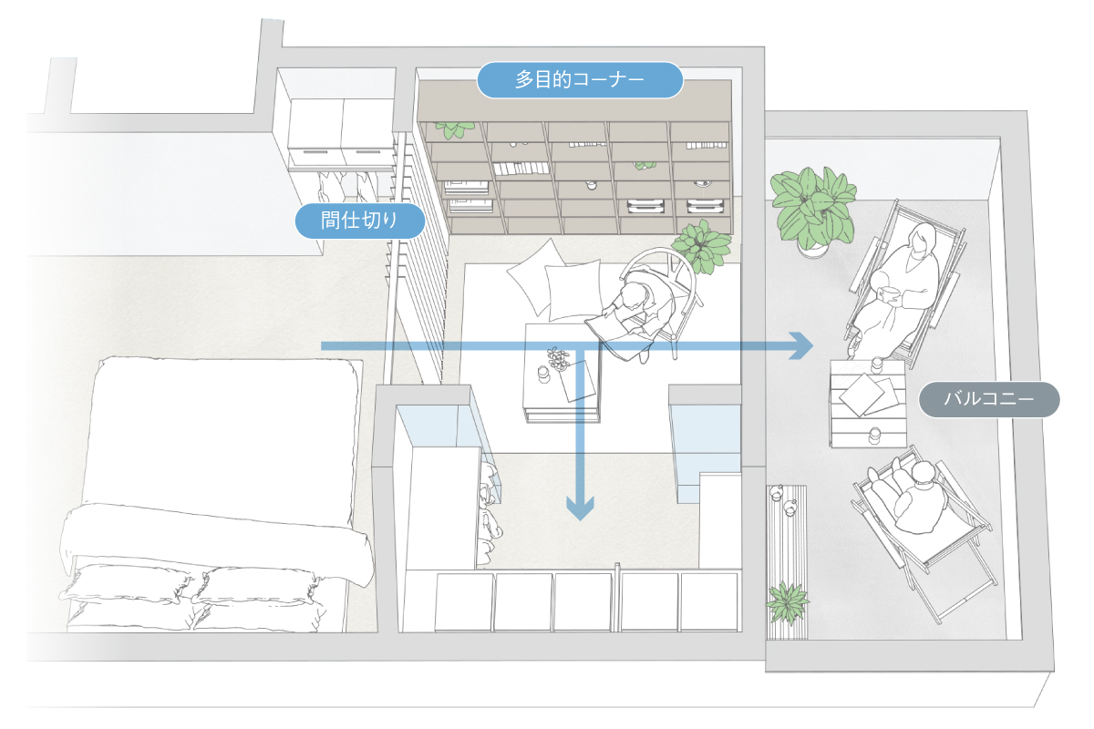 居室とバルコニーをつなぐ中間地点に多目的に使えるコーナーを設けました。洗濯後の家事スペースやプライベート感のある書斎や子どもの遊び場など、間仕切りを切り替えて自由に使えるプラスワン空間です。