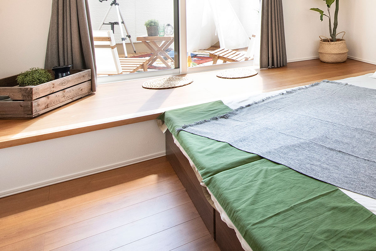 リゾート感のあるバルコニーに隣接する居室に高さを設けた、縁側コーナーを設置。段差に腰をかけて過ごすことで内と外をシームレスにつなげます。収納にアウトドアアイテムを置けばバルコニーの楽しみ方も広がります。