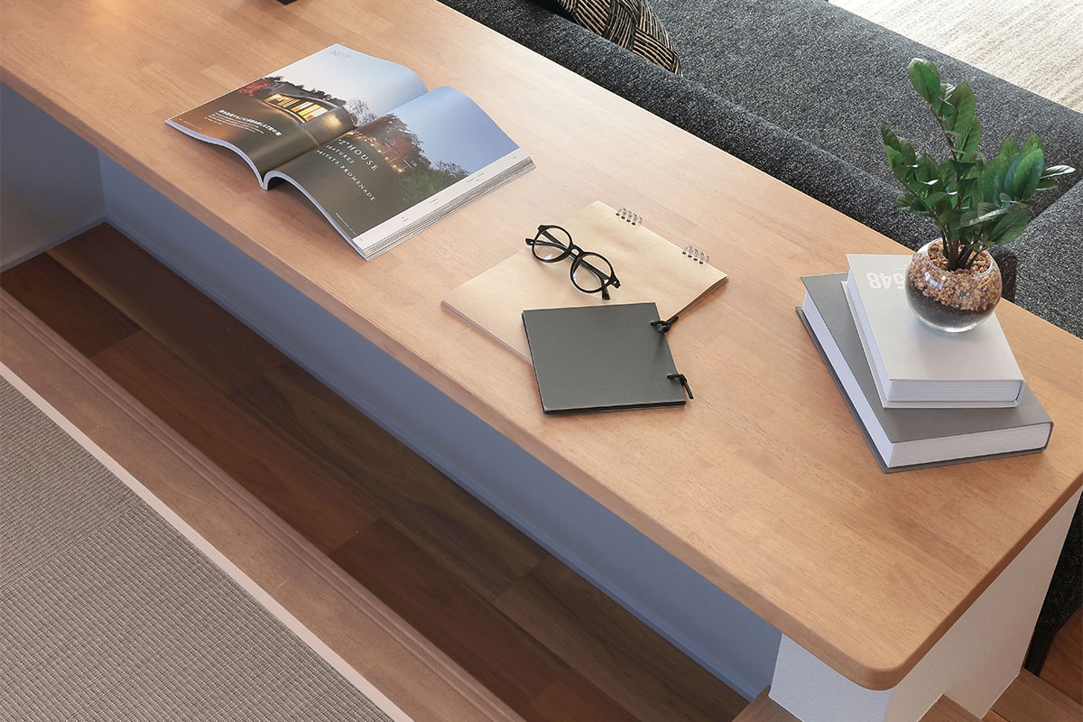 ステージリビングの段差に腰掛けて使える堀机カウンターは、リビング側からも使うことができ、子どもの勉強を見守ったり、一緒に本を読んだり多彩な過ごし方を楽しめます。