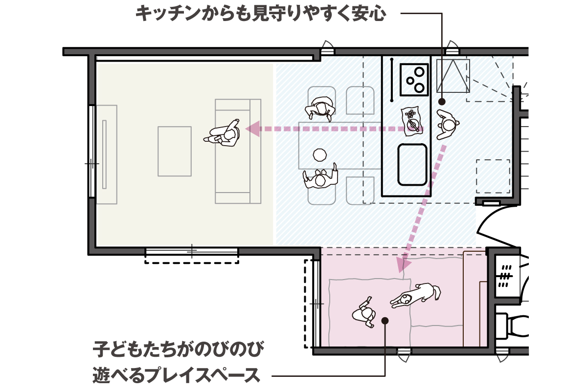 キッチンからも見守りやすいキッチン横の空間を、子どもがのびのびと遊べるプレイスペースに。テントを張れば雨の日でもアウトドア気分を楽しめるおうちキャンプをしたり、カウンターで子どものリビング学習の場としても使えます。