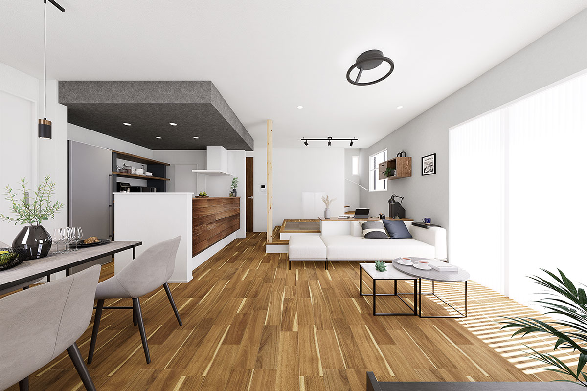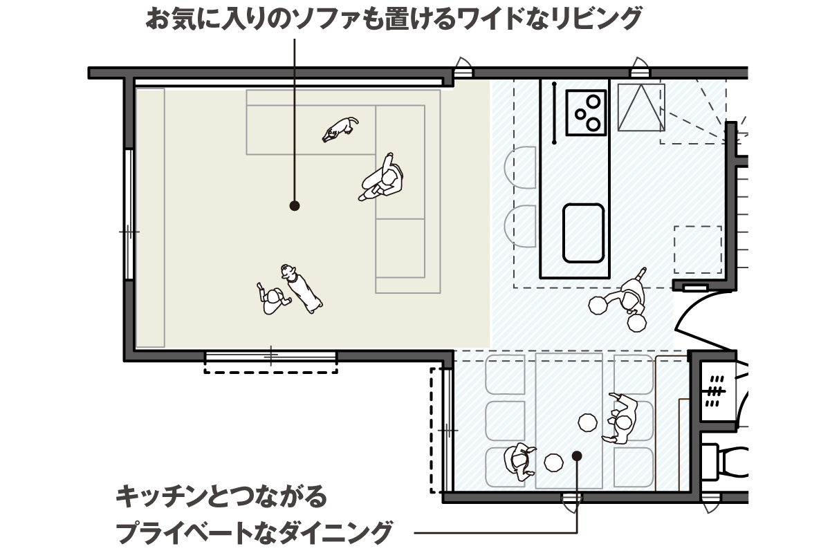 ワイドなリビングとして使って友人を大人数で集まったり、子どもたちが安心して遊べるプレイスペースとして使ったり。家族の成長やライフスタイルに合わせてダイニングをスイッチできる柔軟性の高い住まいです。