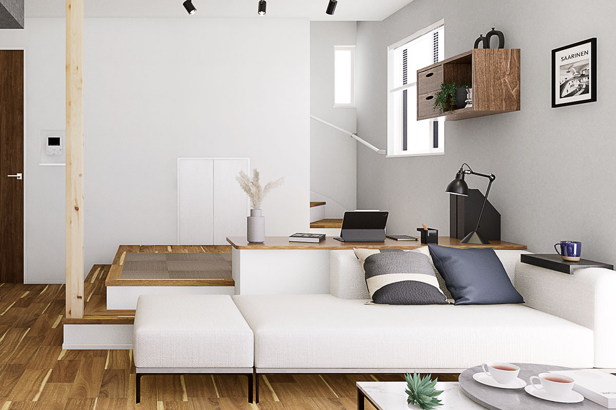 小上がりとなったステージは、程よい独立性がありながらも開放感のある空間。段差で空間をゆるやかに区切ることで、リモートワークや勉強など自分の時間を満喫しながら、家族の気配を感じながら時間と場所を共有できます。