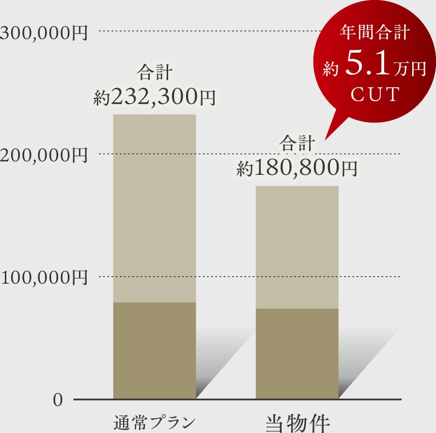 ![]() 発電した電気が使い放題なので冷暖房に最適※2 ![]() 停電時も日中は発電した電気が使える防災力 ![]() 10年後からは無償譲渡で売電収入も望める※3 光熱費シミュレーション ■年間光熱費の比較