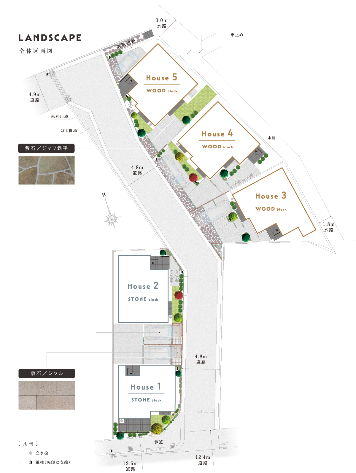 モダンなデザインを纏った全5邸の街並み。通りに沿って左右に分かれた2つの街区それぞれに、
