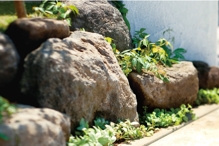 植栽と相性の良い鳥海石。ごつごつとした質感が自然素材ならではの趣を演出します。