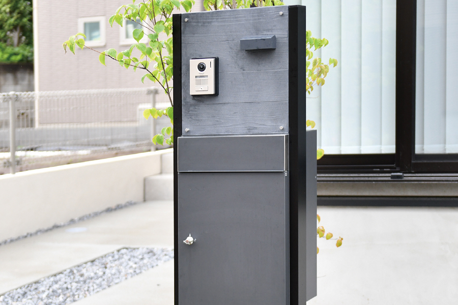 不在時に便利な宅配ボックスをはじめ、郵便ポストやインターホンを一体化した機能門柱を設置しました。スリムなデザインと上品なマットのテクスチャーも魅力です。