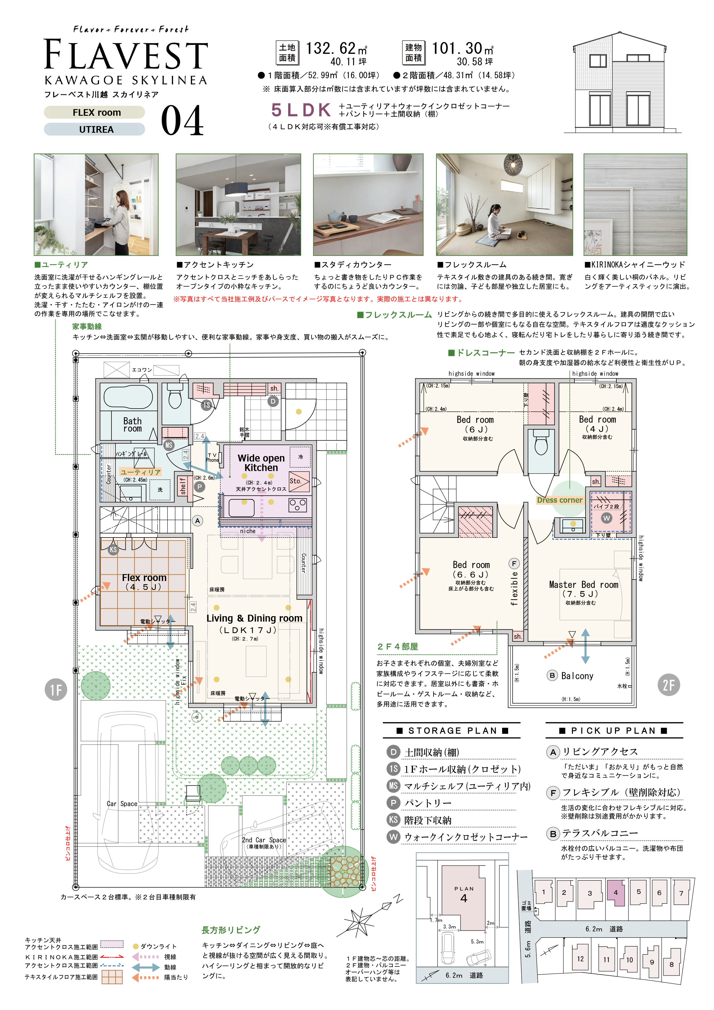 ![]() 2台分カースペース 来客やセカンドカーに対応できるカースペースをご用意しました。 ※2台目車種制限あり。 | ![]() 植生ブロック ![]() ロックガーデン | ![]() 宅配ボックス付機能門柱 |