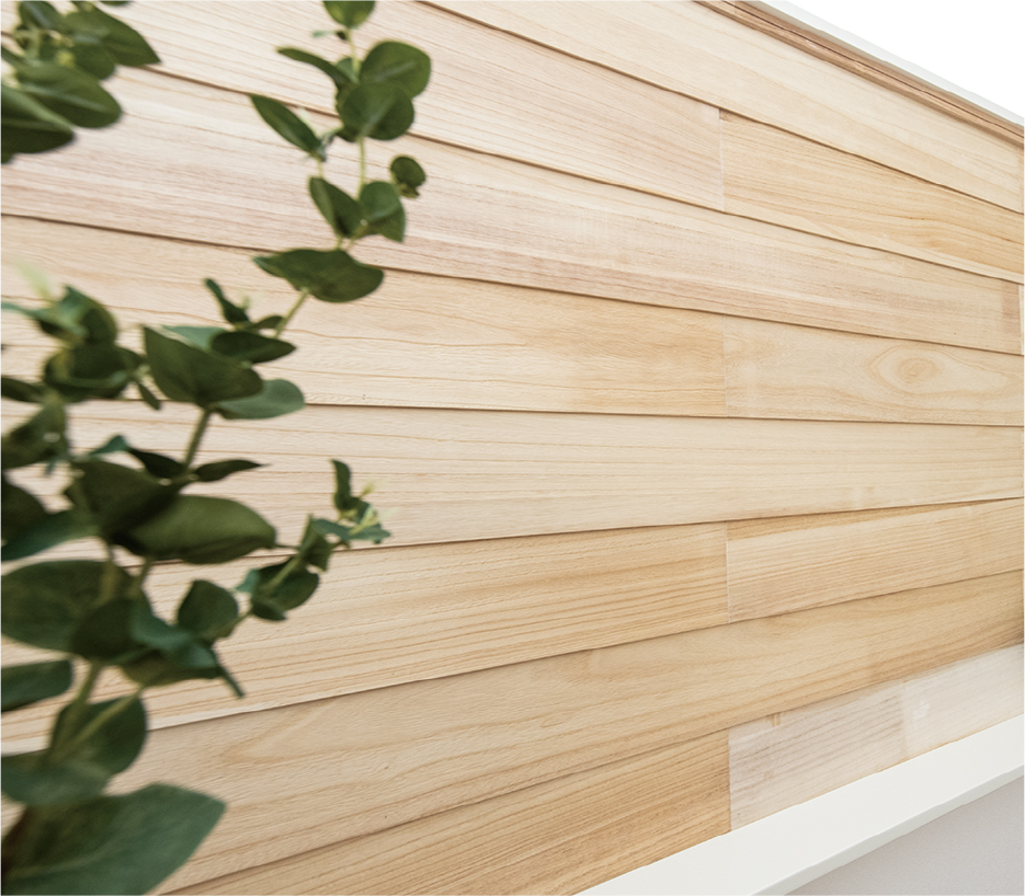 ![]() | ![]() 雪のように煌めく、 KIRINOKAシャイニーウッド 木目の美しさを際立たせる浮づくり加工と、ベースのオイル素地にミルクペイントによる目止め塗装を施した桐壁材。爽やかな白と木目の風合いが光に当たることで空間をアートに彩ります。 |