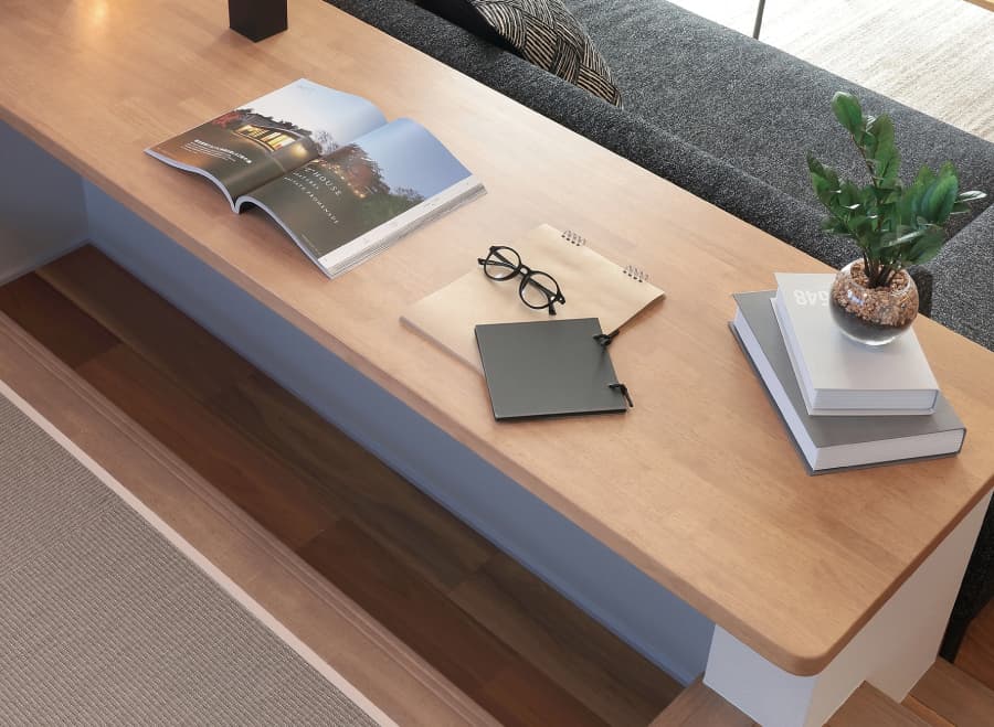 | 家族が自然とつながる アーティスティックな段差空間。 | リビングの一角に開放的なステージを設えた空間は、 リビング、キッチン、そしてステージリビングと別の場所で過ごしていても家族の存在を程よく感じられる、自分時間も家族の絆も大切にできる場所。 アーティスティックな桐壁とともに個性が光る住まいを届けます。 |