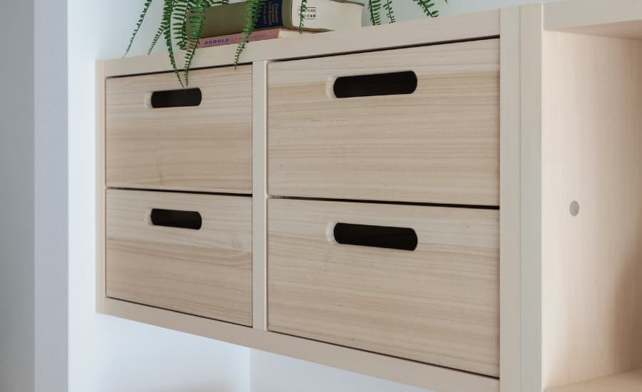 奥行きがあり浮遊感がおしゃれなフロートシェルフを採用。引き出しをつければ書類などの収納として活躍します。 (2段抽斗が2個つきます。) ※掲載の写真はイメージです。 | ![]() | ||||