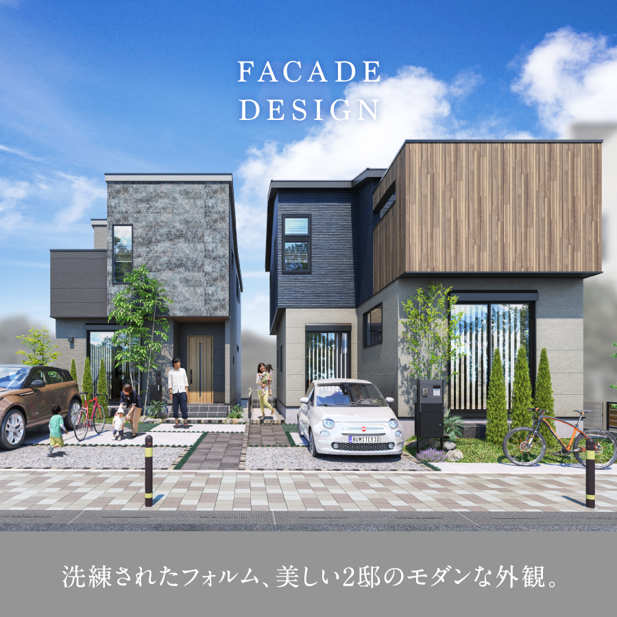 道行く人の視線を惹きつける印象的なファサードや、シンボルツリーと自然素材を用いたエクステリアが美しく調和します。