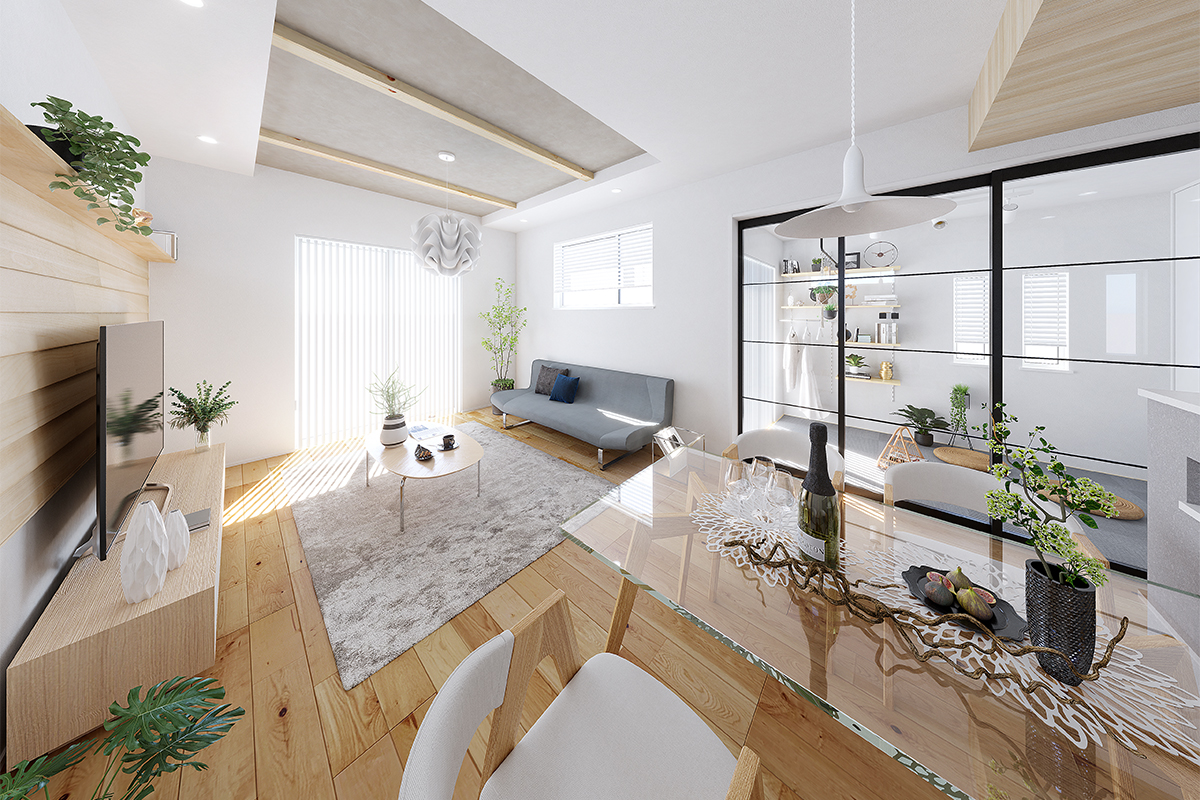 シルキーウッドや天井化粧梁などナチュラル感あふれるリビングは、ガラスの引戸が特徴的なマルチルームを隣にレイアウト。