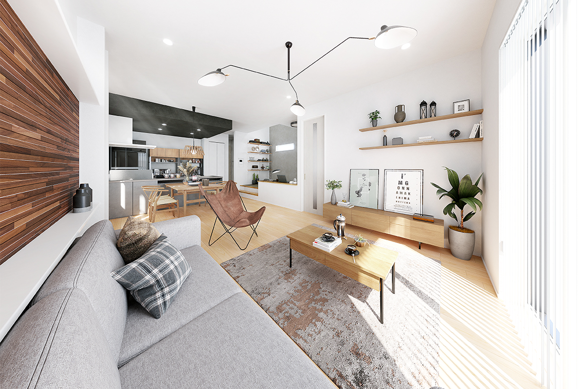 明るく開放感のあるリビングの一角には、小上がりになった段差空間を計画。堀机カウンターを設置することで読書したり、子どもに勉強を教えたり、一緒に映画を観たりと多彩なシーンが生まれます。リビング壁の一部には銘木の美しさをアート作品のように昇華したレリーフを大胆に施し、ワンランク上のくつろぎを味わうことができます。