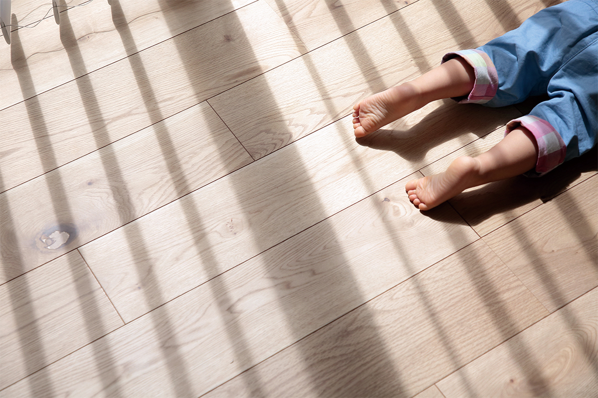 「銘木」と呼ばれる、思わず触れてみたくなる質感と木目の美しさをもつ樹種を使用した、イクタの銘木突板フローリング。さらに光のエネルギーで悪臭やアレルギーの原因となる有害化学物質を分解除去する「エアー・ウォッシュ・フローリング」を採用しています。