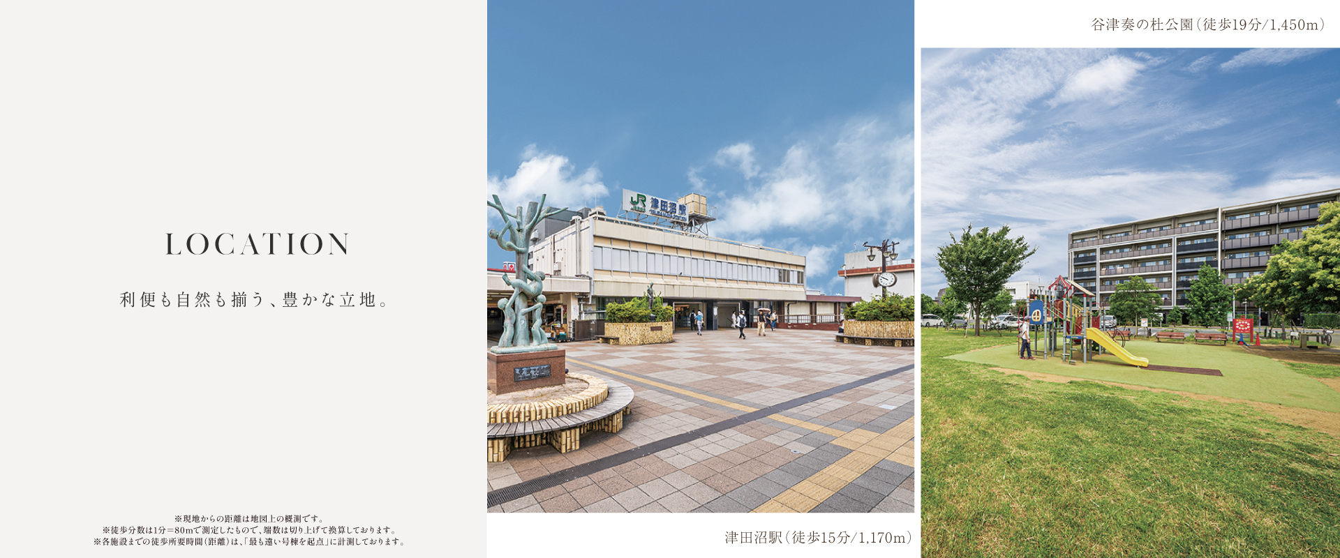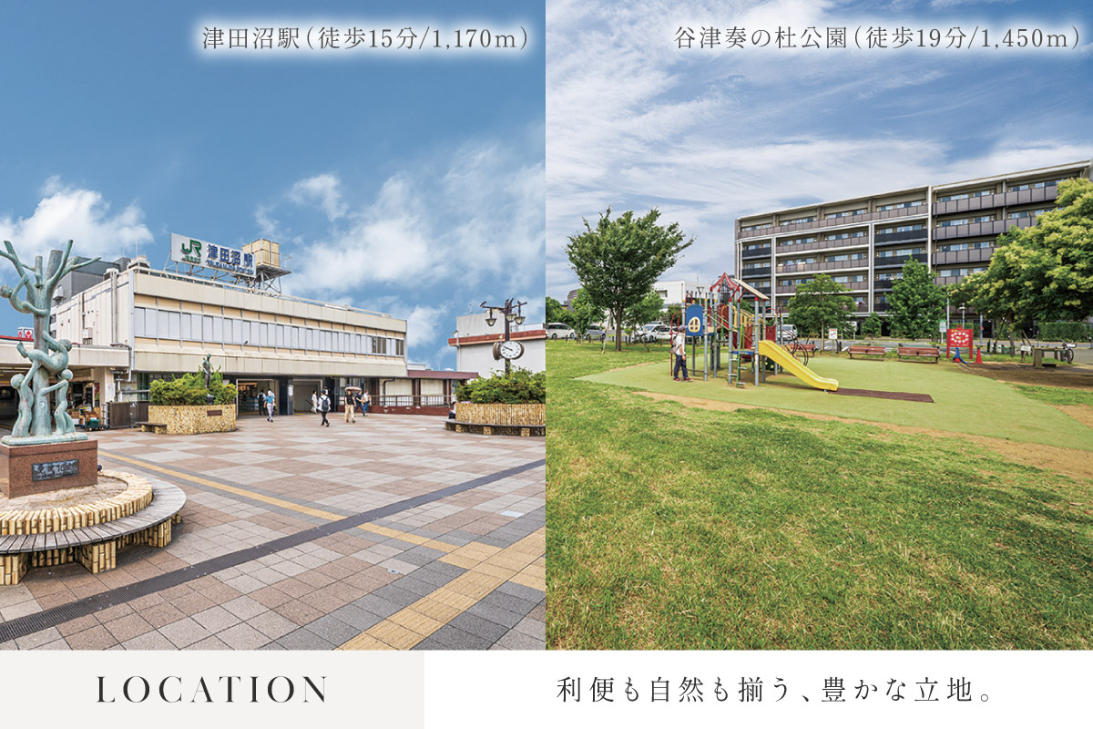 JR総武線「津田沼」駅から徒歩15分。利便と自然が揃う穏やかな地に描く4つの私邸は、四季を彩る植栽と調和した、モダンな造形美を纏う外観デザイン。