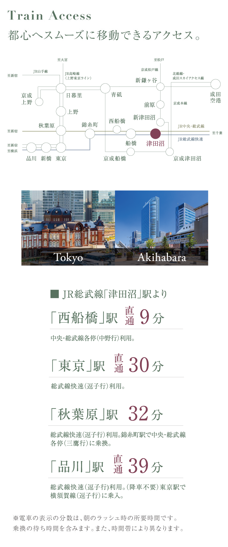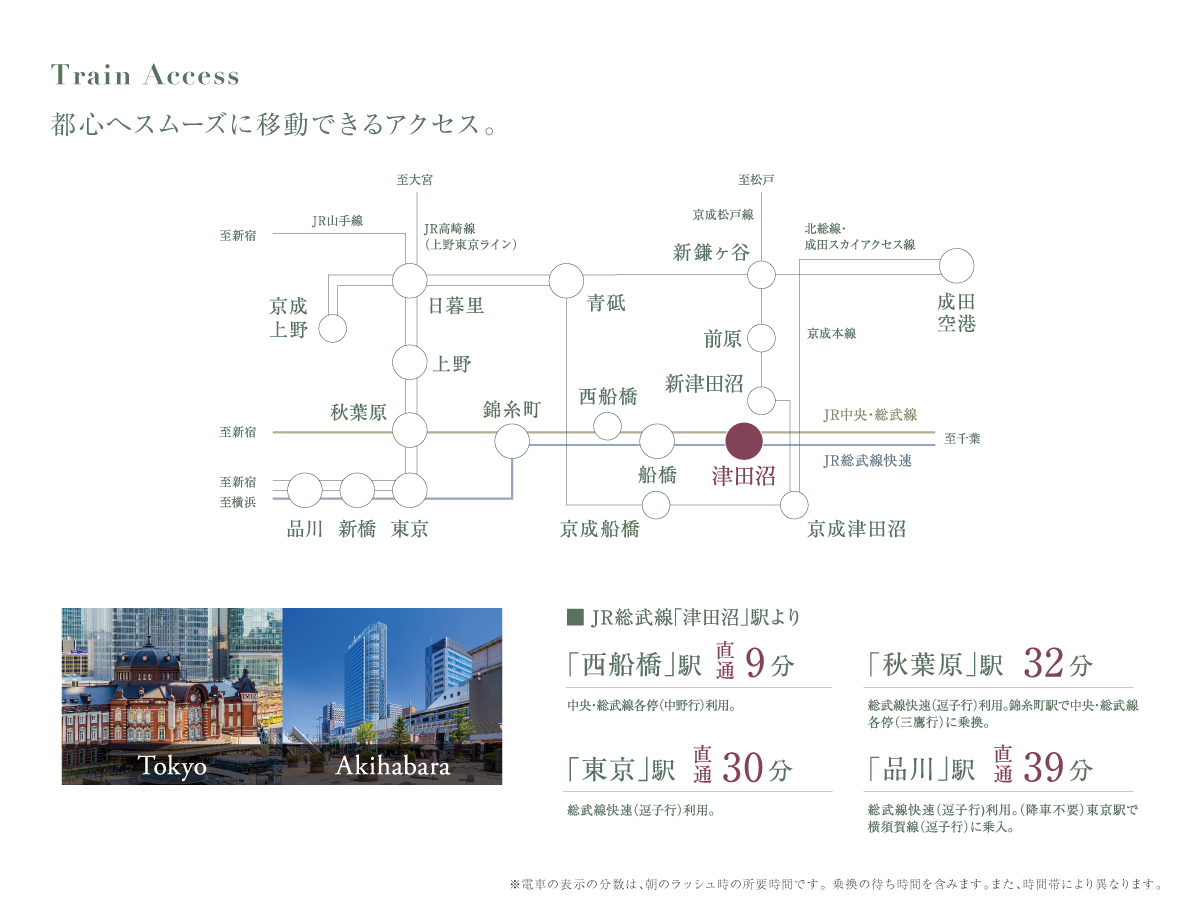 ●津田沼駅より秋葉原駅まで【ラッシュ時: 32分 総武線快速(品川行)利用。錦糸町駅で中央・総武線各停(三鷹行)に乗換。】【平常時: 28分 総武線快速(逗子行)利用。錦糸町駅で中央・総武線各停(三鷹行)に乗換。】