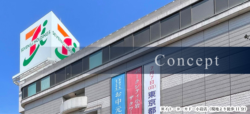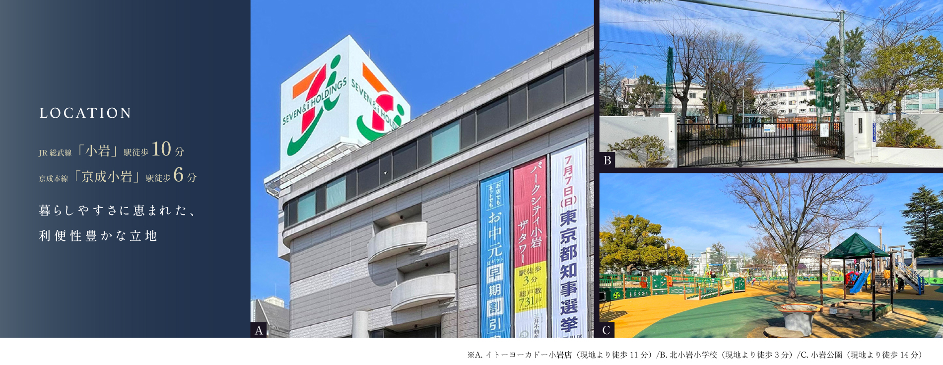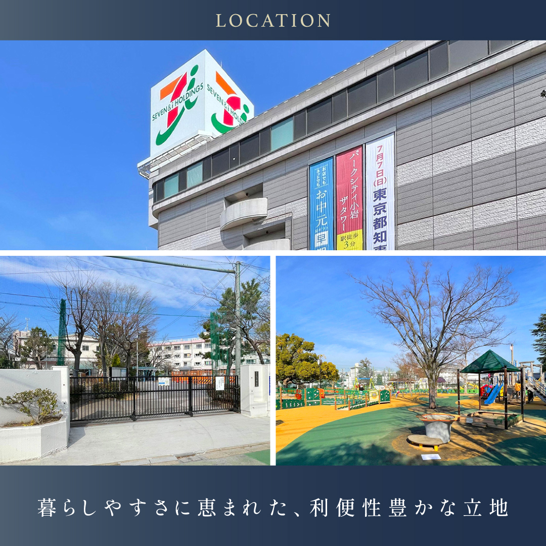 JR中央・総武線「小岩」駅、京成本線「京成小岩」駅の2駅2路線を利用できる利便性に加えて、日々の買い物に便利な商業施設や教育施設、公園が徒歩圏に揃う住環境。暮らしやすさを身近に感じられるロケーションです。