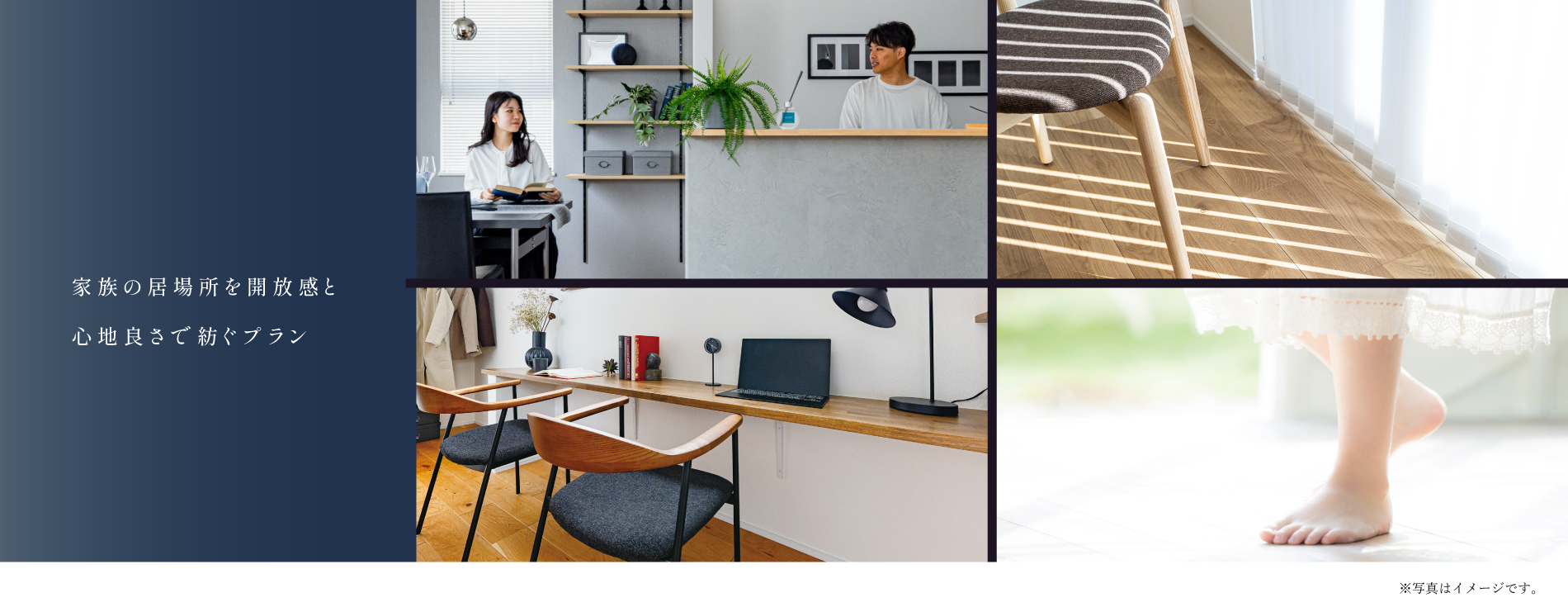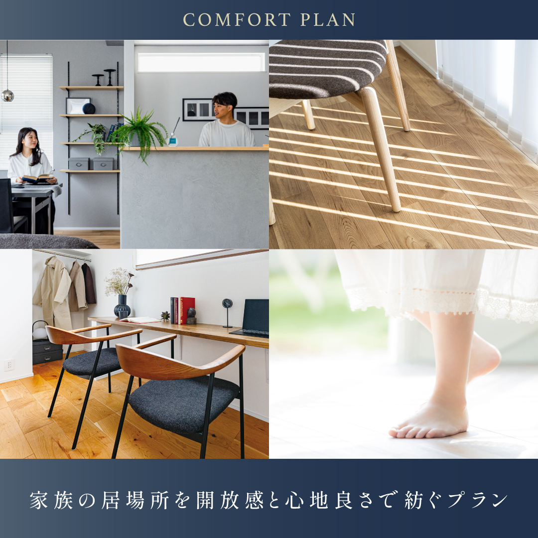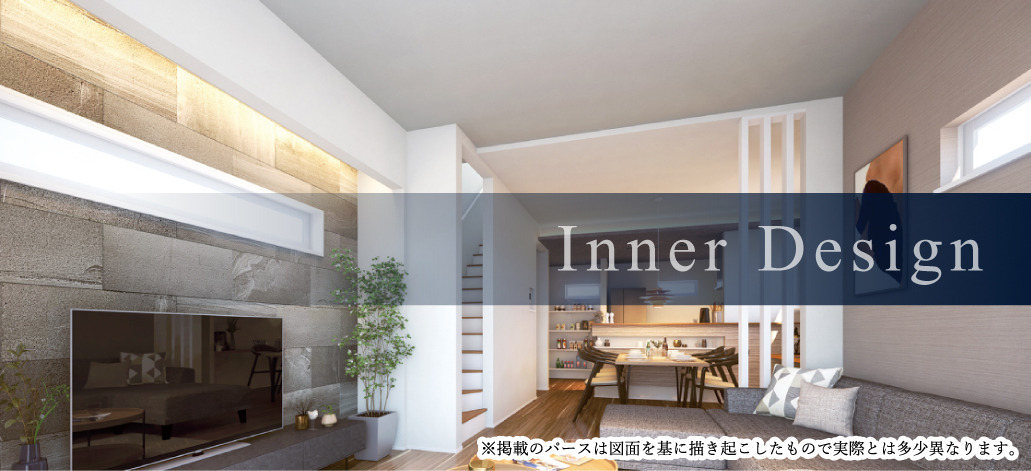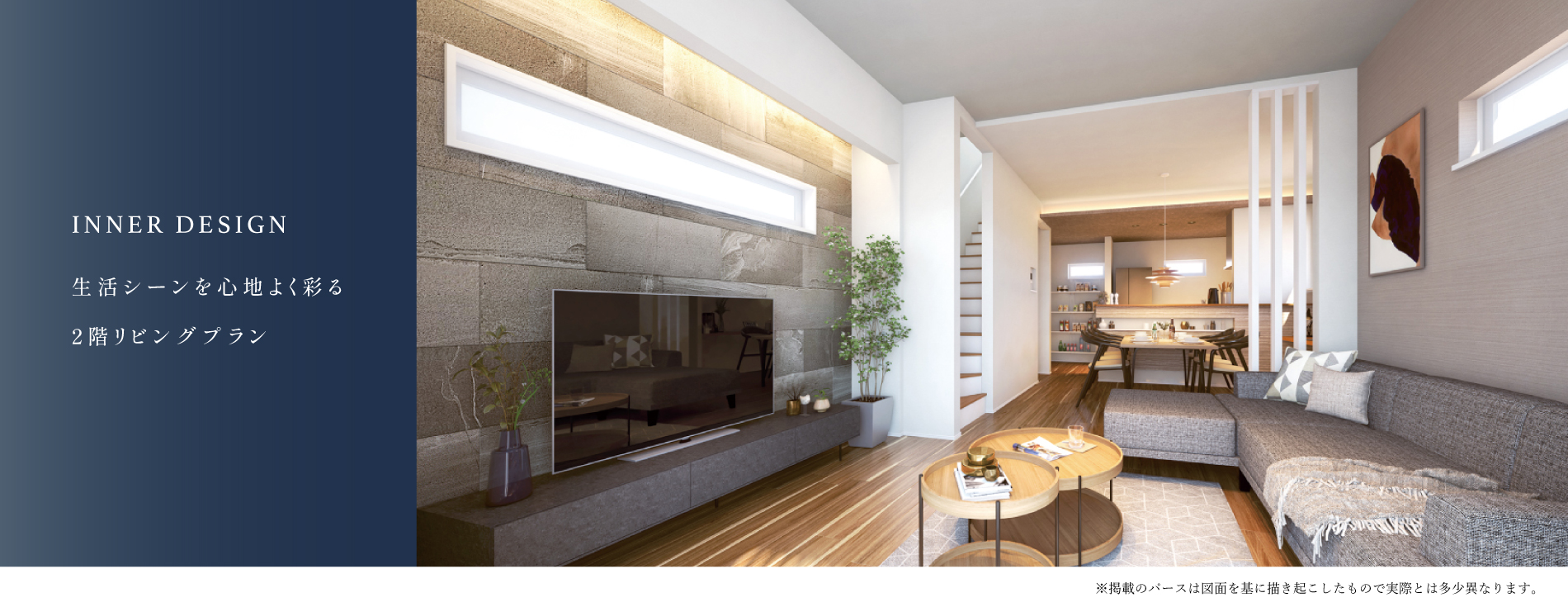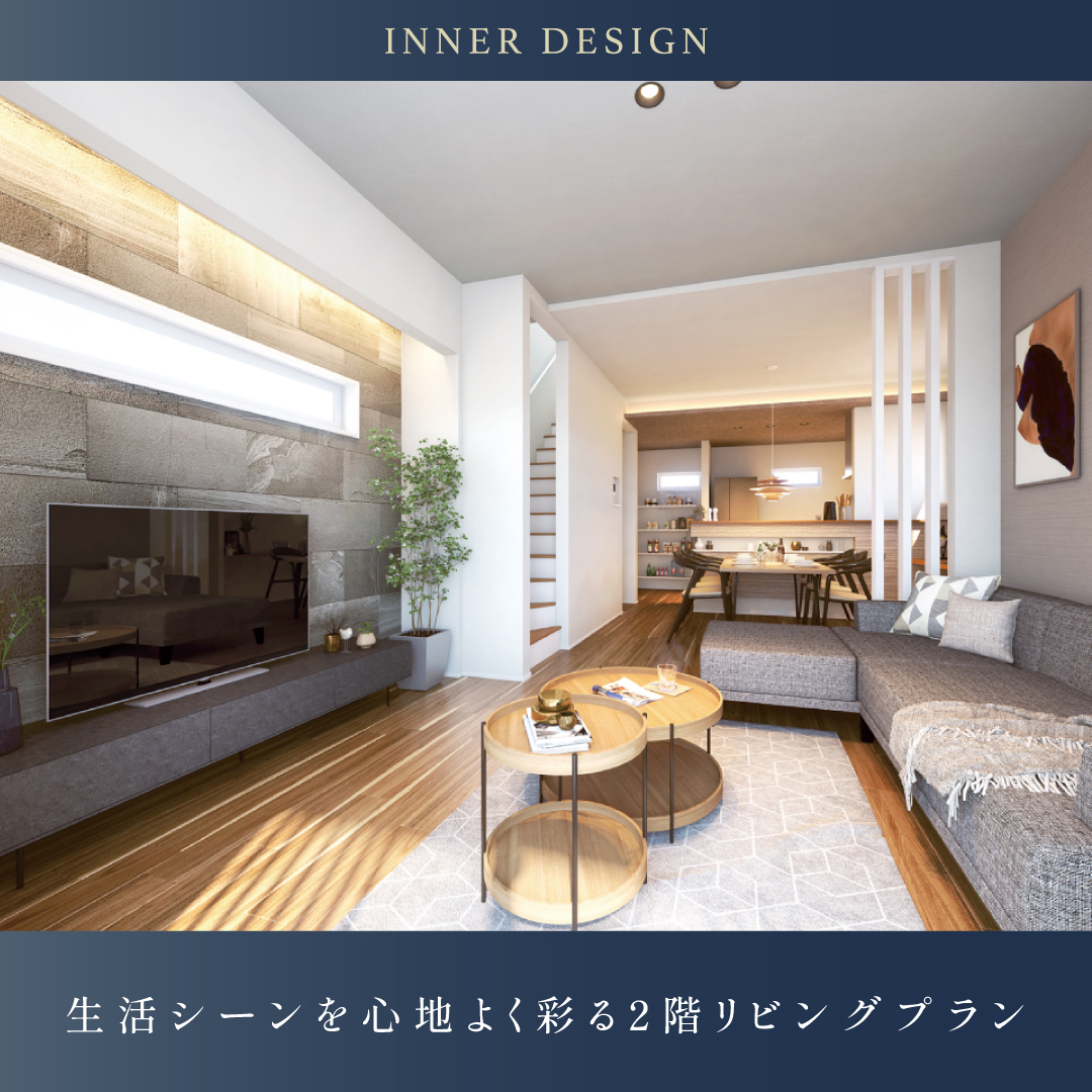 2階リビングがもたらす落ち着きあるプライベート空間に、邸別設計のキッチンが家族の団らんを育みます。銘木フロアや機能性を備えたアクセントウォール、やさしく空間を照らす照明計画が、くつろぎと快適さに満ちた毎日を支えます。